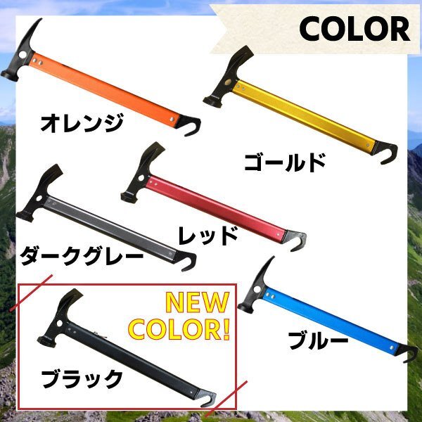 | ☆選べるカラー スチールペグハンマー ※オーダーフォームにご希望の以下のカラーを1つご入力ください。 オレンジ, ゴールド, レッド, ブルー, ブラック ダークグレー:在庫切れ 【商品名】 スチールペグハンマー 【本体仕様】 ◆サイズ:約28cmx11cm 打撃部分:約2.8cm ◆重さ:約360g 【おすすめポイント】 ◆高炭素鋼とアルミニウム合金の素材を活かした、軽量、衝撃吸収が特徴のスチールハンマー。 ◆ストラップ(ハンドロープ)を手首に通して作業することで、怖いスっぽ抜けを防止してくれます。 ◆腐食や磨耗にも強く、耐久性があります。 ◆先端部にペグ抜きの際に便利な穴や突起を完備。楽にテントを片付けられます。 ◆約360gと軽量で女性でも扱いやすく、疲れにくいペグハンマーで登山やツーリングキャンプに適した軽量型のペグハンマーです | ||||