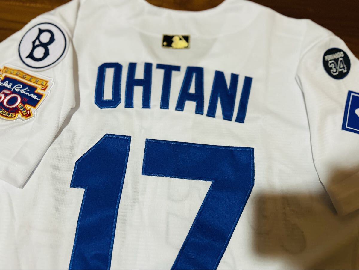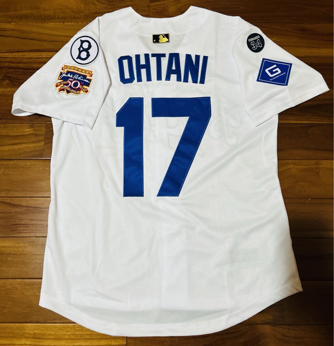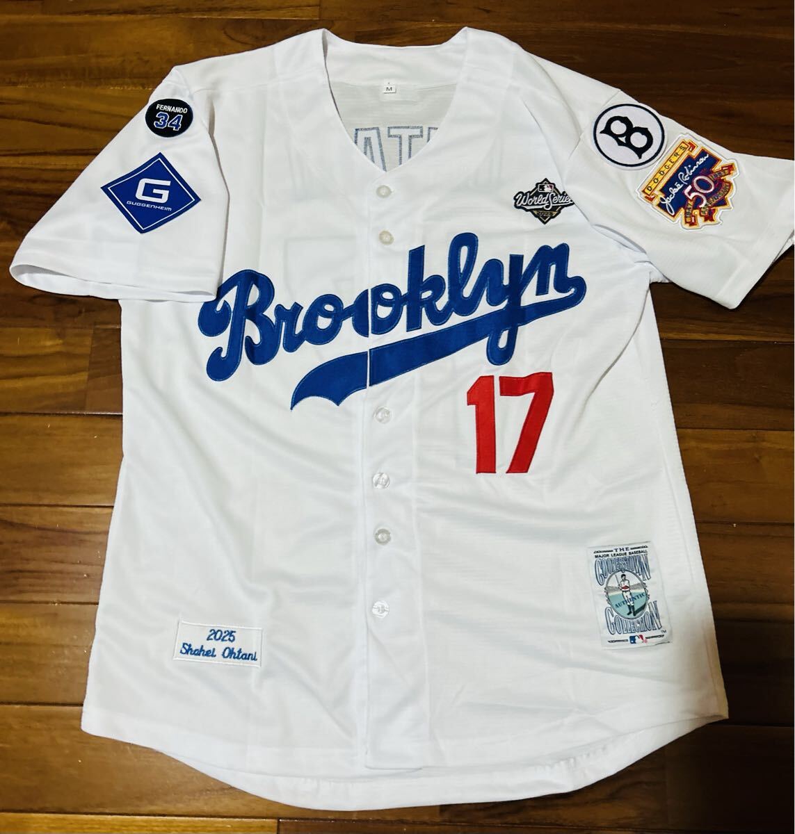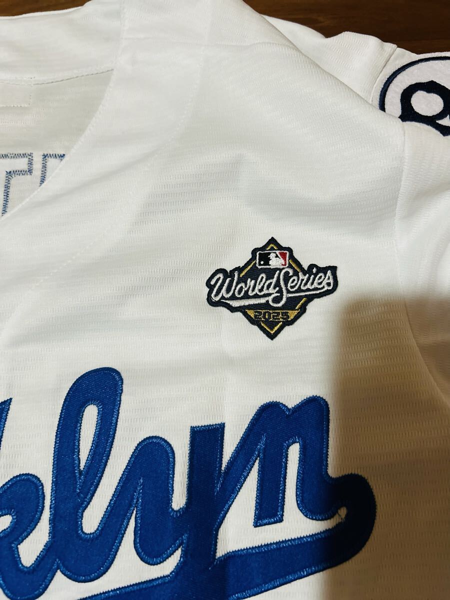 2025WSパッチ付き、腕にはジャッキー・ロビンソン50th記念、ブルックリン時代のロゴ、現状のドジャースのguggenheimとバレンズエラロゴ、後ろには2025限定ゴールドバッターマン仕様。レトロをモチーフにしたクーパーズタウンワッペン付き。
