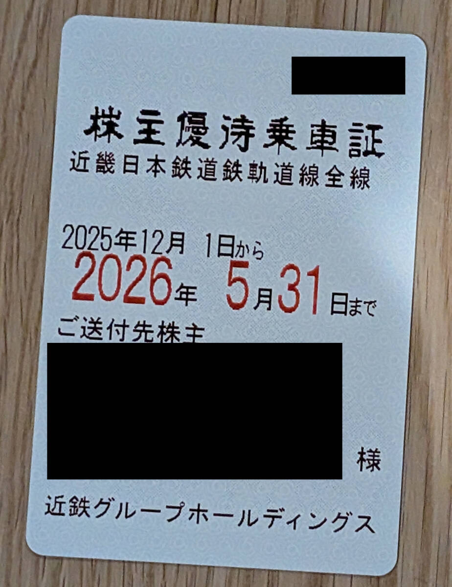 近畿日本鉄道 近鉄の株主優待乗車証です。