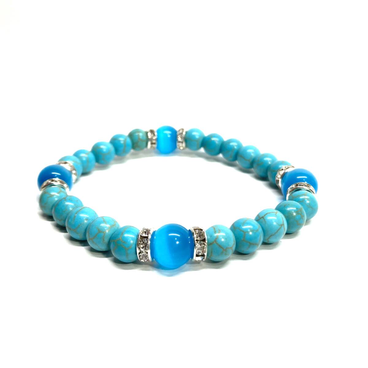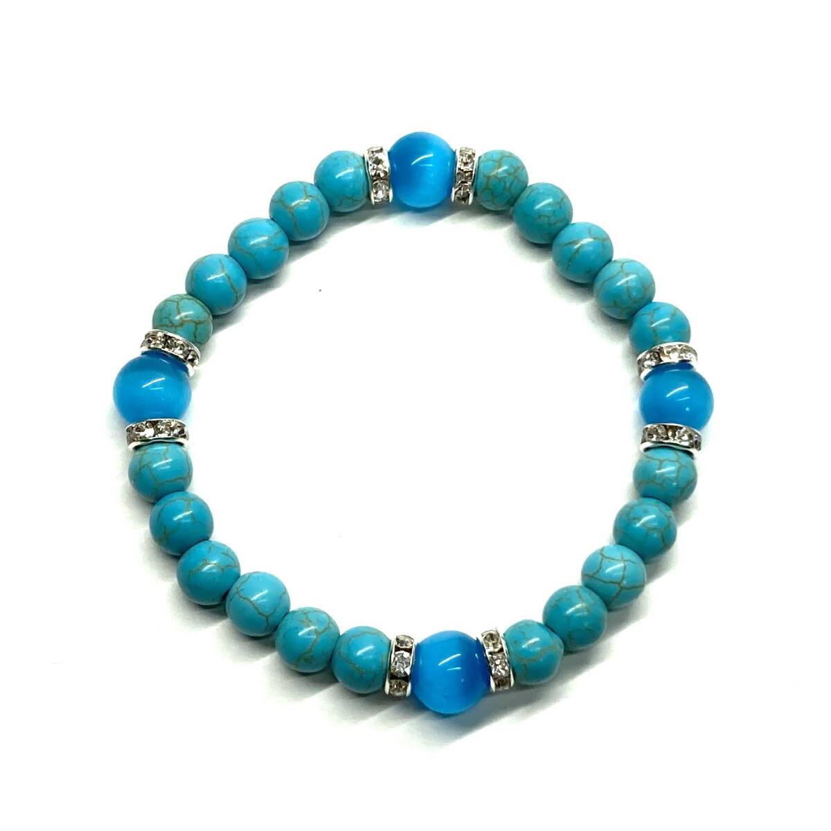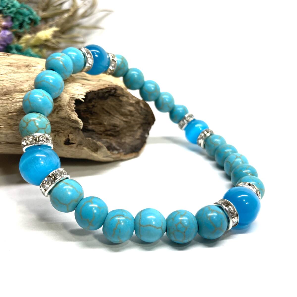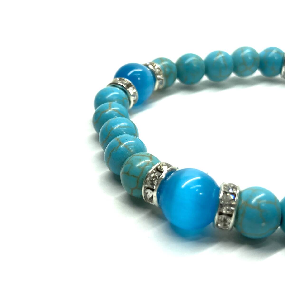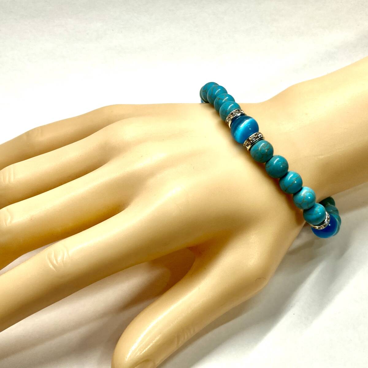 こちらは、8mm玉のキャッツアイとターコイズを使用したパワーストーンブレスレットです。間にはロンデルを挟み高級感ある大人っぽいデザインに仕上がっています。内周約17cmです。気になる方は是非この機会にどうぞ。