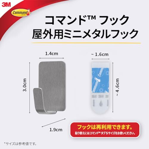 ●屋外用フックミニメタル5個、耐UV粘着タブSサイズ5枚 ●壁を傷つけない、しっかりはれて、キレイにはがせる屋外用フック ●耐荷重:220g、フックサイズ(cm):3.1×1.9×1.7 ●ステンレス製のメタルタイプ ●リースやバナーなどの装飾に
