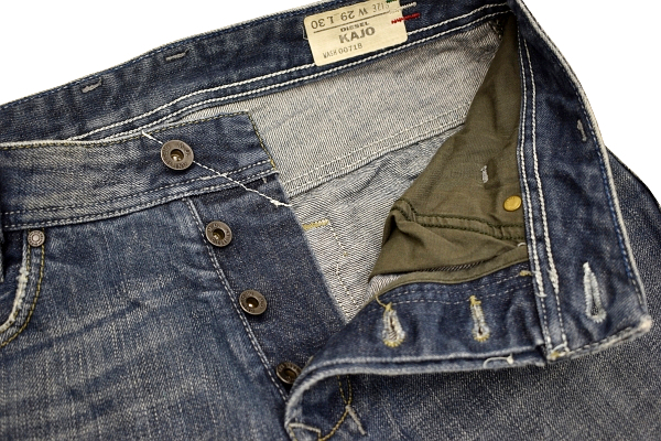 濃紺デニム ヴィンテージウォッシュ加工 クラッシュ加工 ドーナツボタン ボタンフライ ストレートジーンズ