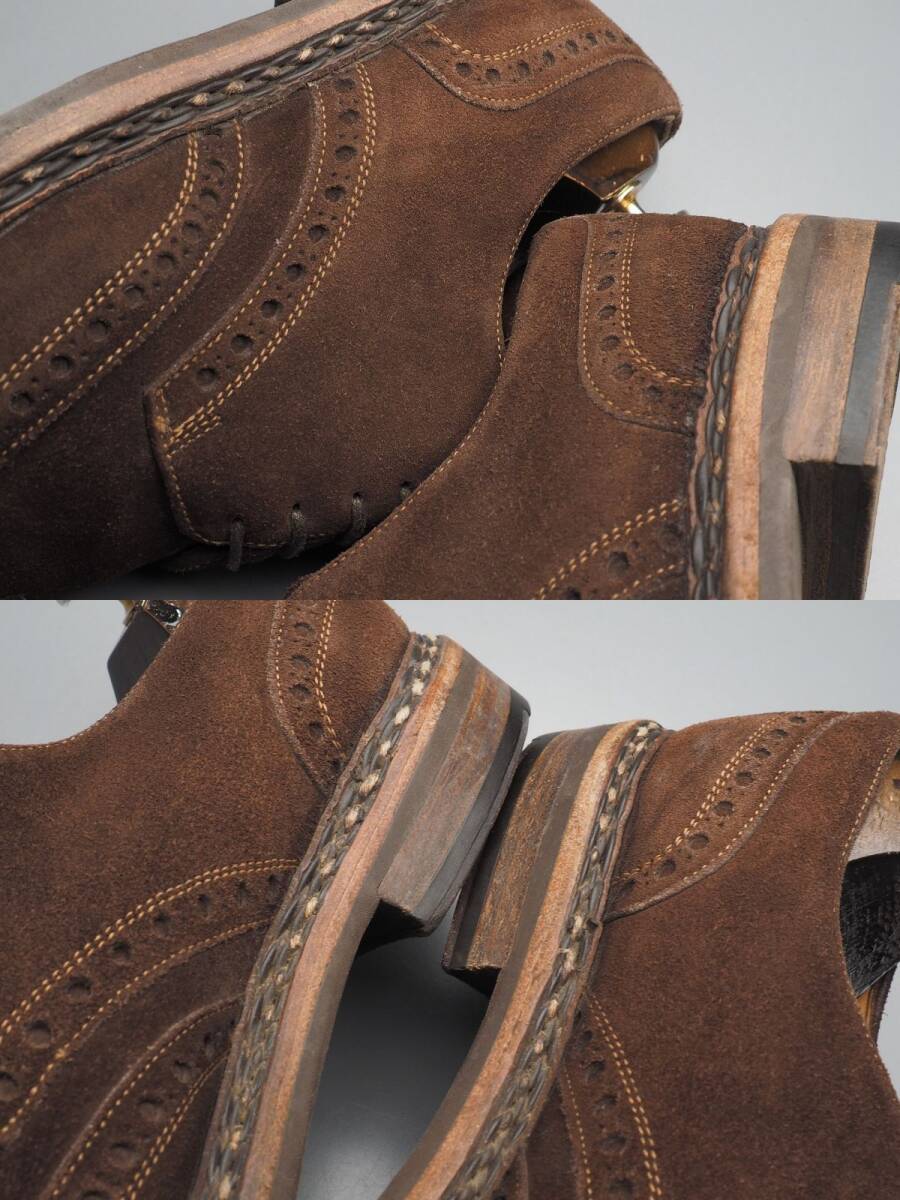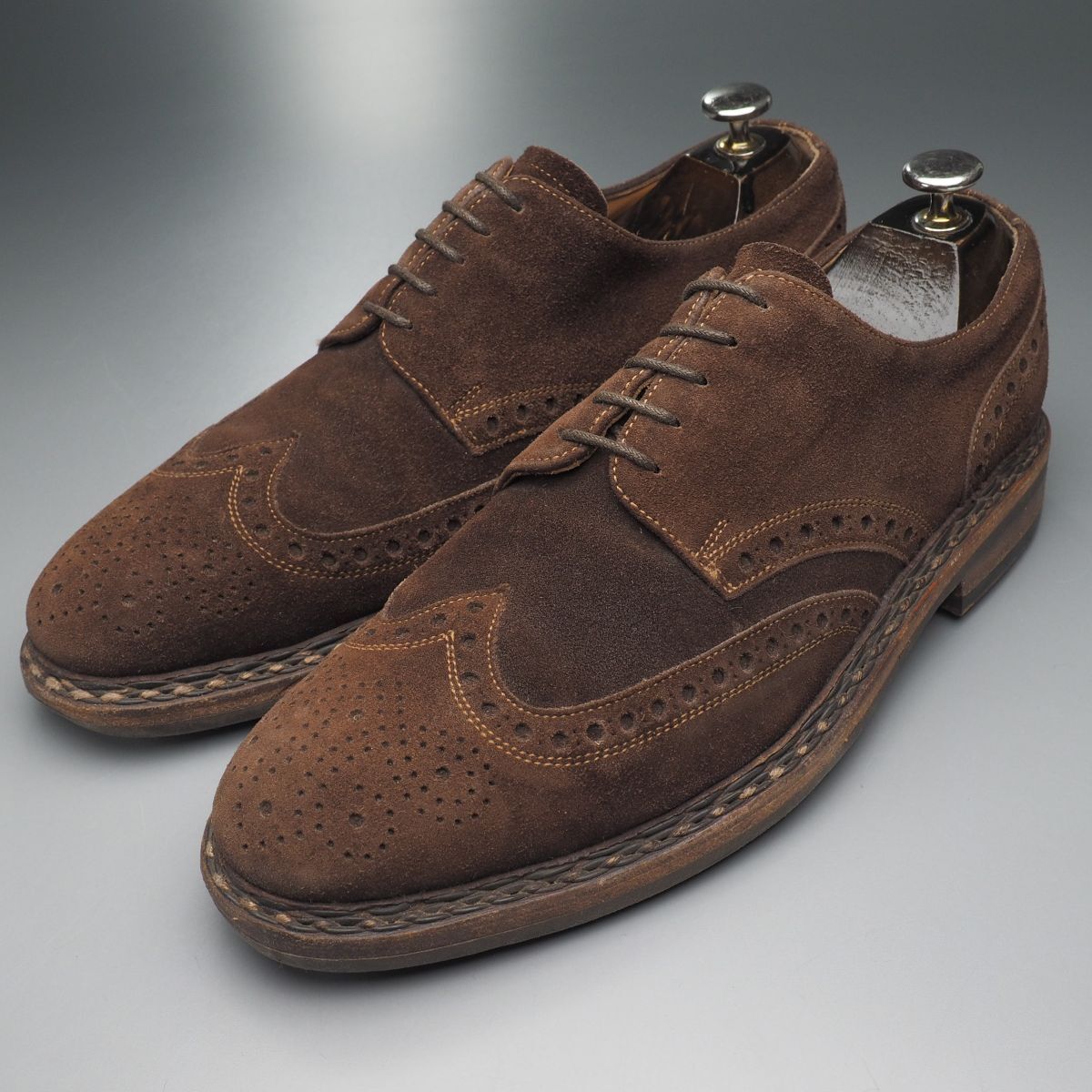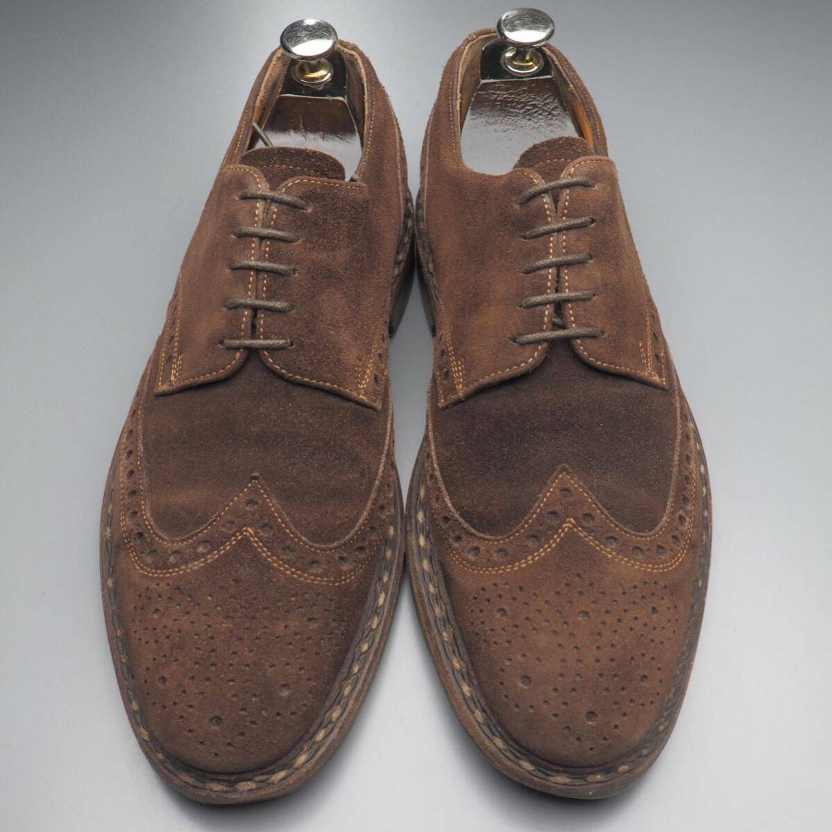 靴のロールスロイスとも称されるドイツの老舗名門高級靴ブランド「ハインリッヒディンケラッカー/Heinrich Dinkelacker」の一足です。 茶のスウェード革をアッパーに用いたフルブローグの5アイレットダービー。 アウトソールはダブルソール仕立て、底付けにはノルウェイジャン製法を採用し、重厚感のあるタフな仕上がりとなっております。 製法:ノルウェイジャン アウトソール:ラバー ライニング:レザー ※撮影用のシューキーパーは付属致しません。 ※本物の商品ですのでご安心の上オークションをお楽しみ下さい。 ※タイトル頭の英数字は弊社の管理番号です。 ※ほかにも多数の商品を出品しています。 ※同梱に関しましては「まとめて取引」でのみ対応可能です、その他の方法での同梱対応は出来かねます。 (※商品の特性上、同梱対応出来ない商品もございますので予めご了承下さい。) |