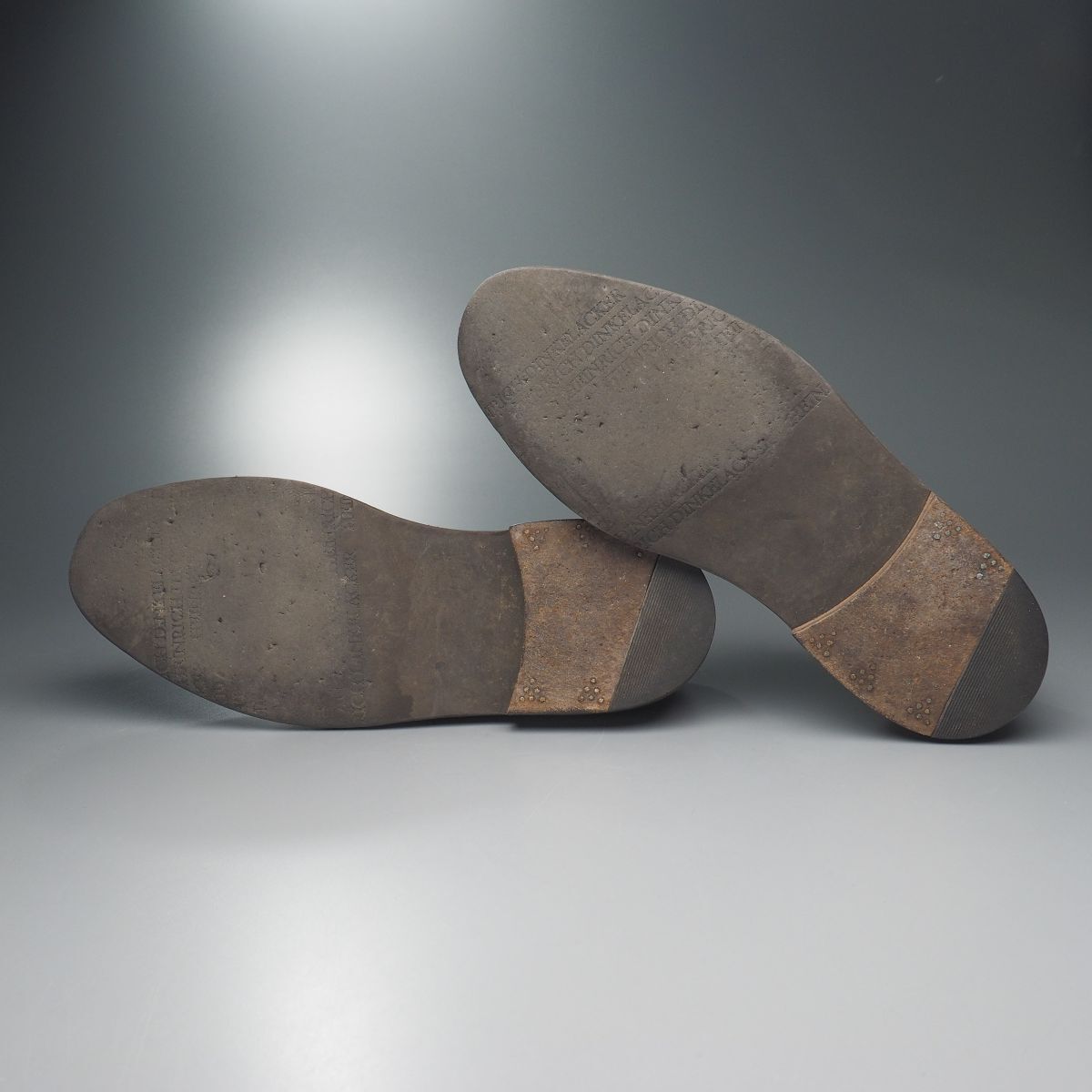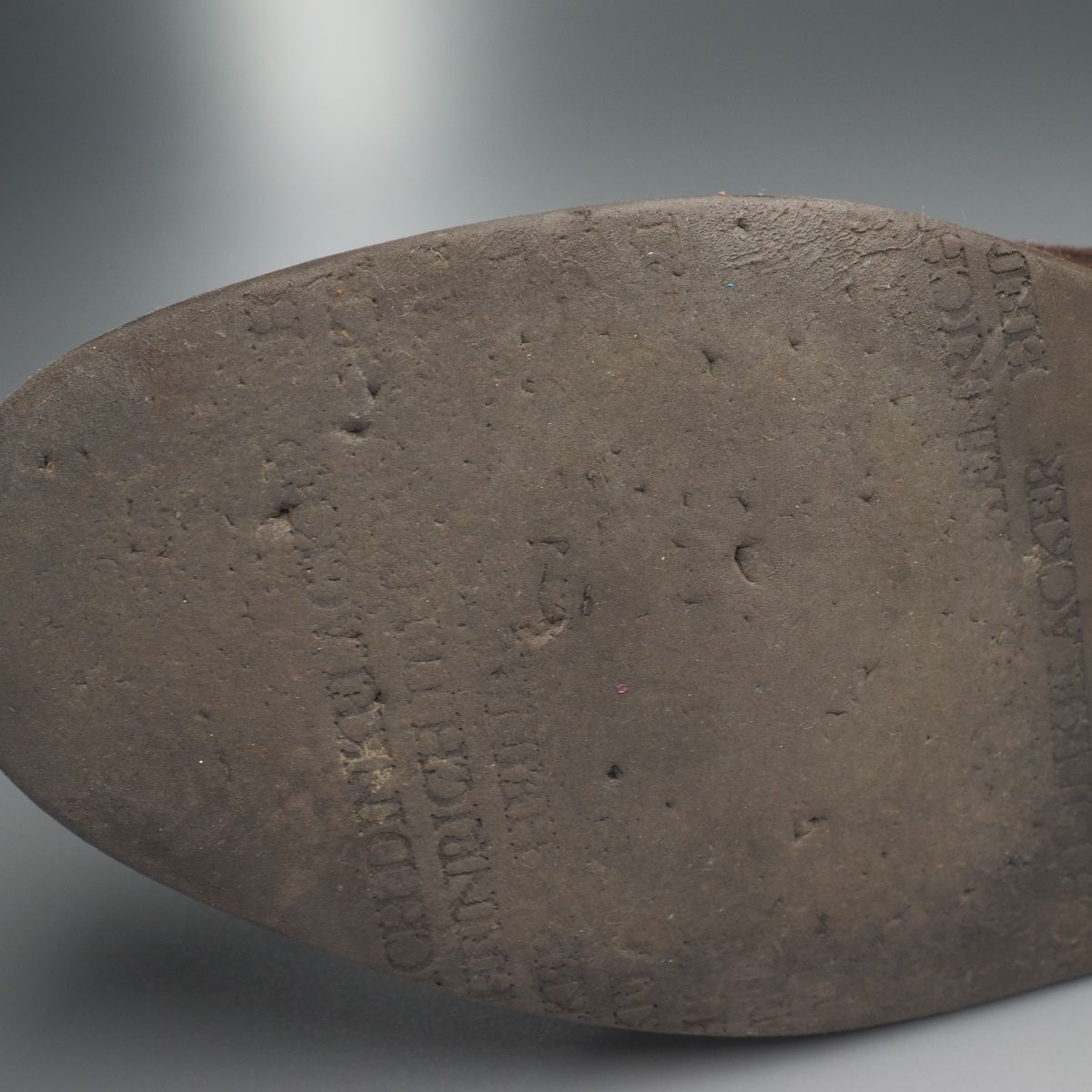 【コンディション詳細】 アッパーのシワ、履き口やかかと部分に若干型崩れ、薄い擦れや色ムラ、薄汚れ、インソールやライニングの擦れや汚れ、シミなど見られますが、その他支障になるようなダメージ等はなくこれからも十分にご愛用いただけるコンディションです。 アウトソールの減りはトゥで3mm程度、ヒールで2mm程度です。 |
