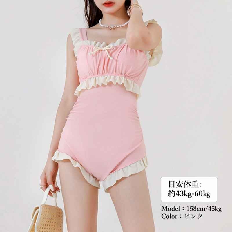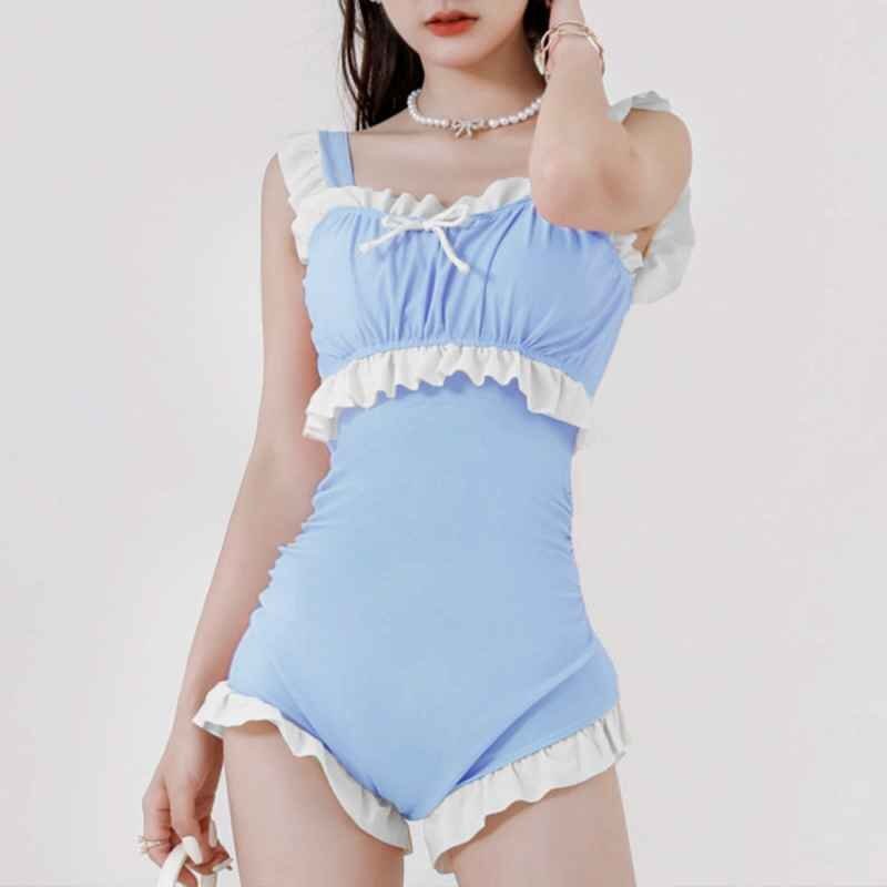 フリル仕様の韓国風モノキニワンピース水着です。甘すぎないフリルデザインで大人可愛いスタイルに◎