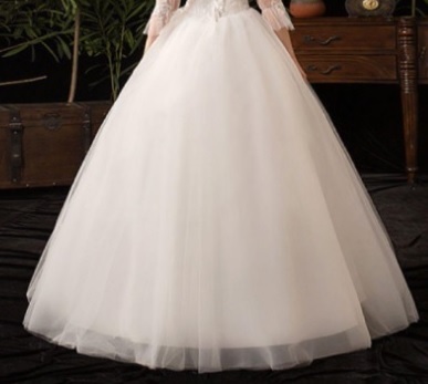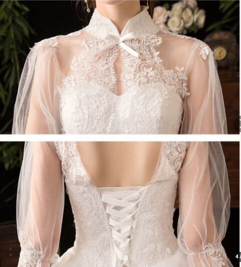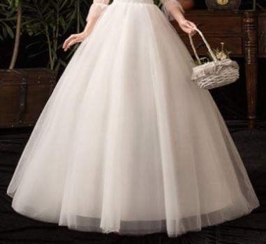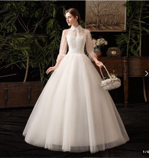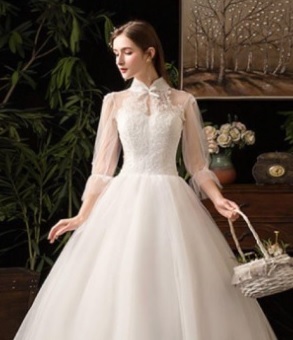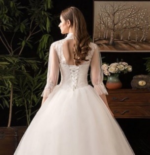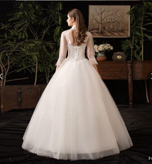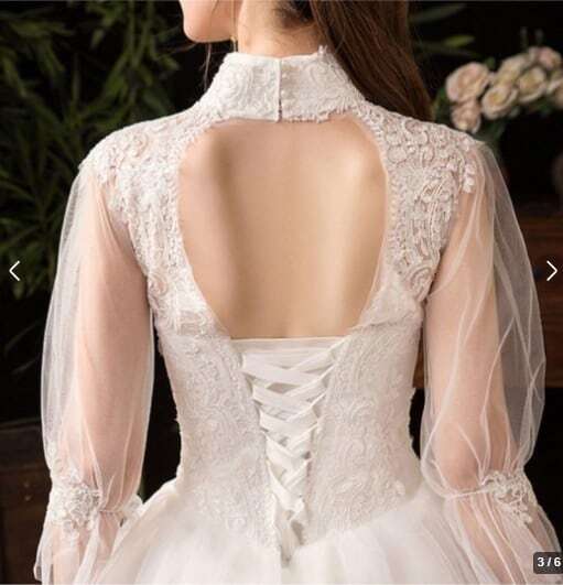 ハイネックプリンセスウエディングドレスです。トップス部分は刺繍がほどこされ、縦襟のフォーマルさと、背中の大胆な空き具合のコントラストがかえってエレガントで豪華です。胸元からウエスト下にかけて綺麗なAラインに広がり豪華かつエレガントな雰囲気を醸し出しています。ウエディングドレスとしても、また、パーティやイベント、結婚式など、様々なシーンで、気品のある印象を与えてくれる一枚です。裏地付き。背中腰から下ファスナ-有。(背中編上げで結び紐有り)。胸パット付。背中編上げなので2~3cmのバストサイズの幅は結び具合により大丈夫です。