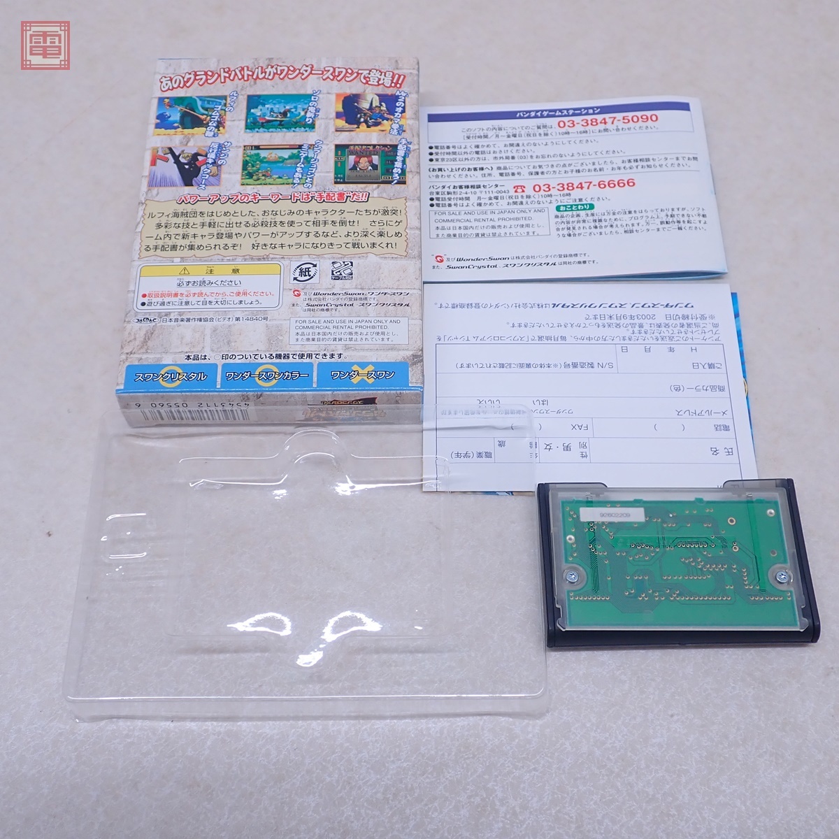 動作保証品 WSC ワンダースワンカラー From TV animation ONE PIECE グランドバトル スワンクリスタル バンダイ BANDAI 箱説ハガキ付 こちらの商品は動作保証品となりますので、一週間の動作保証をお付けします。 ■箱にスレ、キズがあります。 ■取扱説明書にスレ、ホチキス部のサビがあります。 ■カセットにスレ、キズがあります。 ■写真のものが全てです。付属物の有無や状態については写真からご判断ください。 ■付属物については細かいチェックはしておりませんので、万が一、欠品があったり余計な物が入っていたとしてもご了承ください。 ■商品到着後、当店の保証期間中は、商品及び箱や取説、付属品などを1つでも廃棄や破損をしないようにお願い致します。廃棄や破損をした場合、商品に問題があった場合でも対応や返金などの対処ができなくなります。 ■商品によりますが、発売されてから10年以上経過している中古品である事をご理解頂いた上でご入札をお願い致します。なお、新品や美品、また特記事項がある場合は別途明記します。 | |||