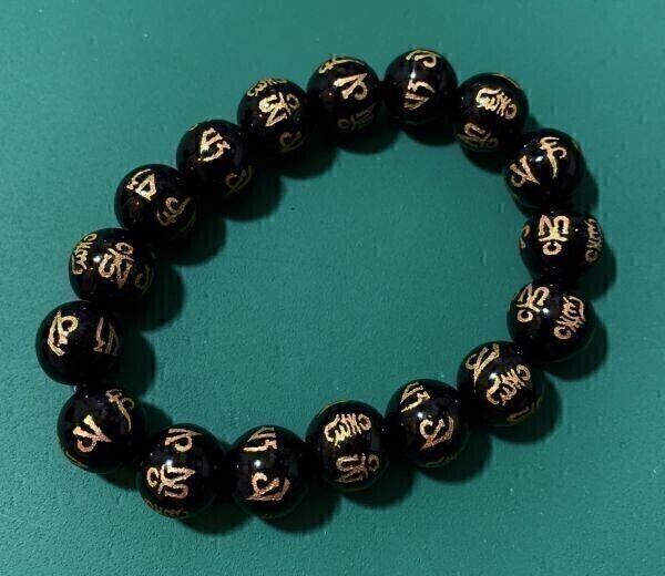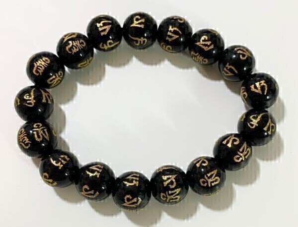 【Premio Fortuna】黒樹脂の六字真言(マントラ)ブレスレット 12ミリ珠使用 全珠に金の真言刻印 S6jfpeUH 152