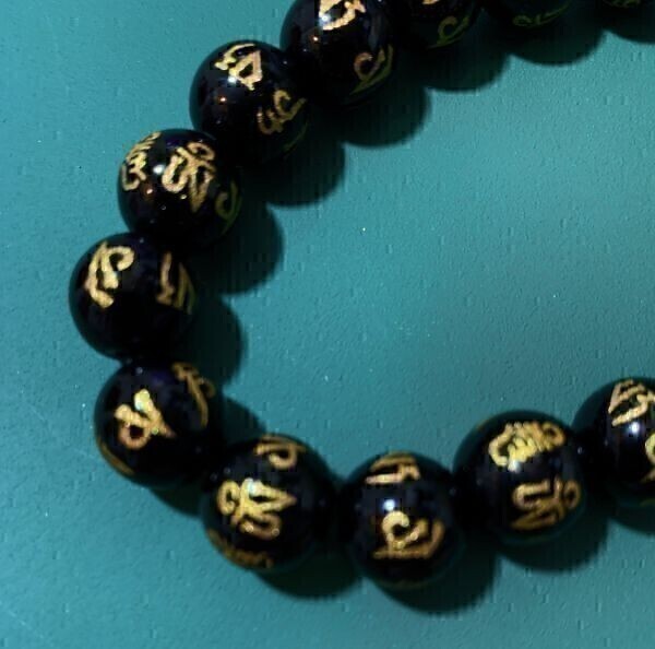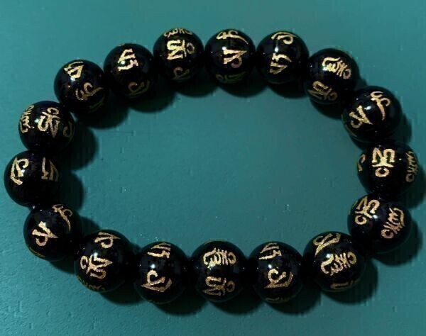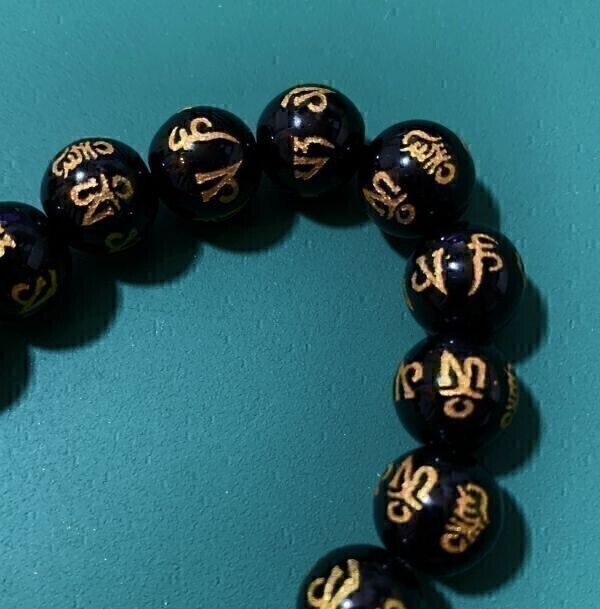 黒樹脂の12ミリ珠に、鮮やかな金文字で六字真言が刻まれています。この真言は観世音菩薩の慈悲を表現しているため、観音六字とも呼ばれ、観音のご利益を体現しています。観音=音を観るという姿勢は、すべての人々の願いを聞きとどけるというお役目に繋がっています。大変有難い真言です。手首サイズ17.5センチまでの方に。
