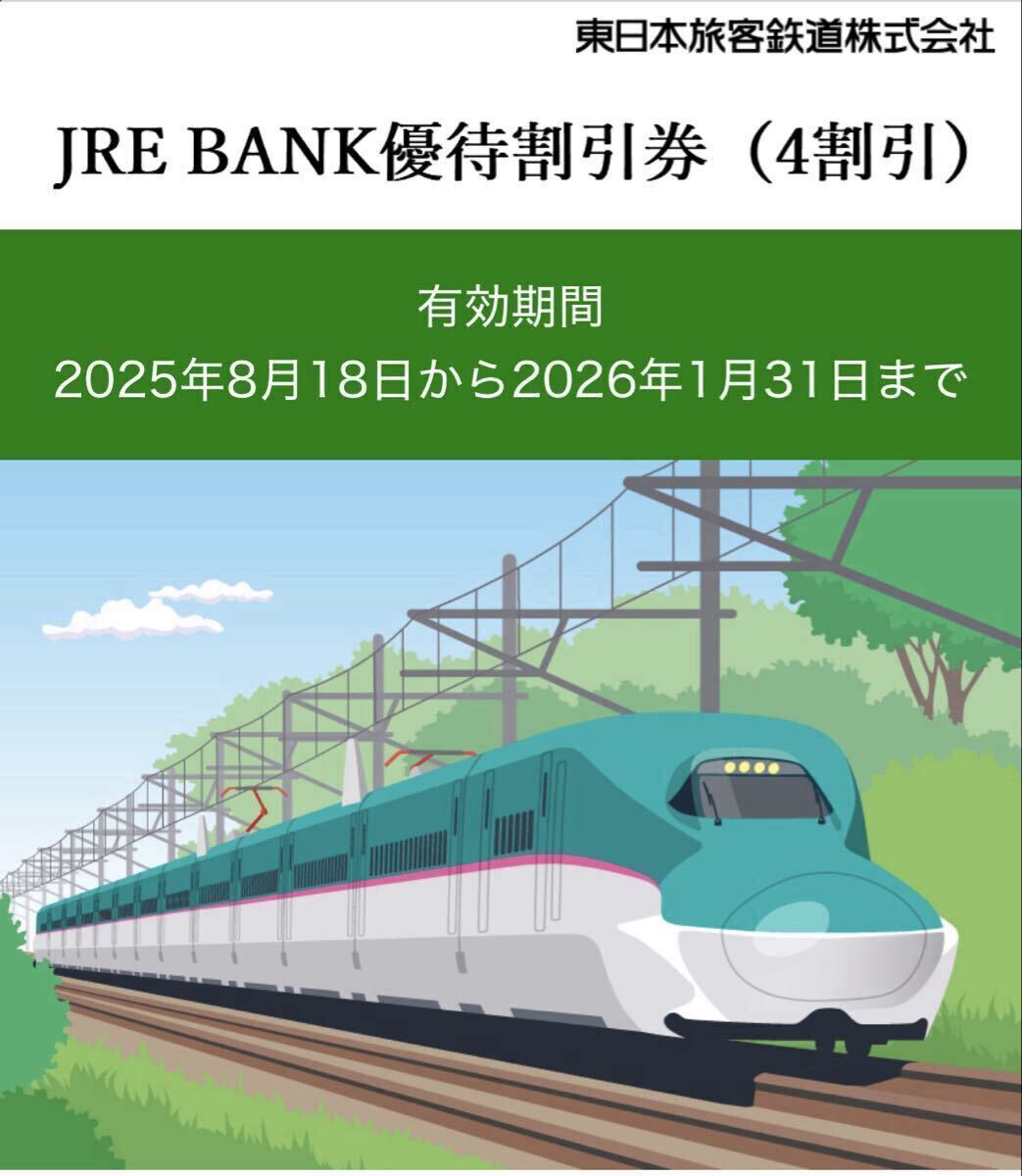 JRE BANKの優待割引券で「えきねっと」にてJR東日本を4割引でご利用いただけます。2枚での出品です。