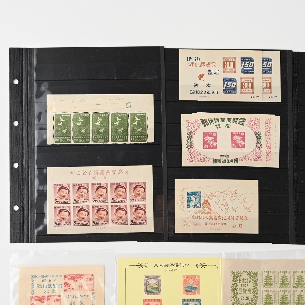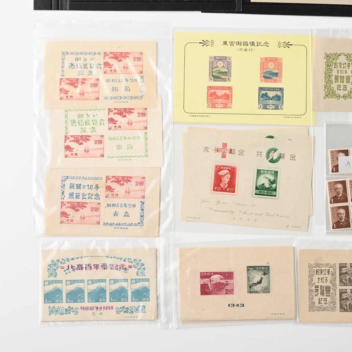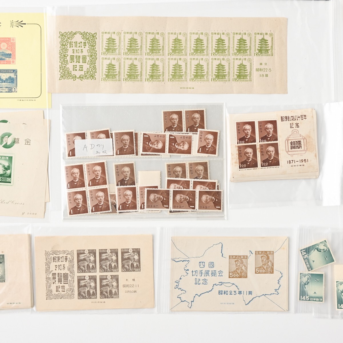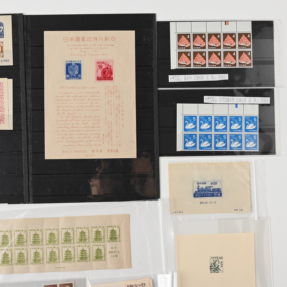 カラーマーク(CM)付き切手、記念切手 小型シート ブロック バラなどをまとめた古切手のコレクションです。 整理台紙・透明パック入りで保存されており、全て消印はありません(目視での確認です)。 確認したかぎり内2点、模刻品がございます。 ※経年品・コレクター収集整理品としての出品です。 お譲り受けしたのち、真贋・分類・評価などは専門家による鑑定を受けておりませんので、切手のリストの内容は参考情報としてご覧ください。内容の絶対的な保証はできかねます。 商品の状態(透かし、糊の状態など)については、数が多いため一点一点の確認はしておりません。 写真にて現状をご確認いただき、ご判断をお願いいたします。NCNR前提の現状品でのお渡しとなります。 また、当方専門家ではございませんので、専門的なご質問にはお答えできませんこと、何卒ご容赦ください。 下記、切手の内容リストです。 <未使用>1949年 万国郵便連合 75年記念 小型シート 21枚 <未使用>選挙事務用切手 昭和22年 農夫図 2円 6枚(ブロック) <未使用>昭和 透かし無 国宝 石山寺多宝塔 80銭 小型シート 1枚 <未使用>郵便切手を知る展覧会記念 法隆寺五重塔 1円20銭 15面シート 昭和22年 銘柄付き 1シート <未使用>1948年 赤十字 共同募金 小型シート 4枚 <未使用>航空切手 大仏航空 145円 バラ3枚 <未使用>切手趣味の週間記念 昭和22年 1円 5枚小型シート計7シート(うち2シートは昭和23年北斎百年祭記念品) <未使用他混在>郵便創始80年 前島密 1.00円 1951年 小型シート (未使用シート14枚+使用済シート1枚(2枚切取済)) <未使用>AD糊 前島密 1円 普通切手 田型&バラ 20枚 <未使用>コブハクチョウ 5円 CM10B 正規版B2 とじ穴なし 10枚ブロック <未使用>貝 4円 CM10B 正規版 B2 とじ穴なし 10枚ブロック <未使用>明るい通信展覧会記念 昭和23年 福島 小型シート 1枚 <未使用>明るい通信展覧会記念 昭和23年 東京 小型シート 2枚 <消印有含?>新聞と切手展覧会記念 昭和23年 青森 小型シート 2枚(※うち1枚うっすらと消印跡のような形跡が見えます) <未使用>郵便切手を知る展覧会記念 小型シート 札幌 昭和22年 3枚 <未使用>明るい通信展覧会記念 小型シート 熊本 昭和23年 2枚 <未使用>通信展覧会記念切手 昭和23年 3月 大阪 小型シート 3枚(うち1枚昭和23年4月三島版) <未使用>長崎国際文化都市建設記念 長崎名所と鳩 8円 昭和24年 5枚ブロック(台紙に銘板部分一部貼り付け) <未使用>鉄道75年記念 5円 小型シート 昭和22年 印刷局製造 2枚 <未使用>犬山こども博覧会記念 記念切手 小型シート 1枚 <未使用>四国切手博覧会 記念切手 小型シート 昭和23年 2枚 <未使用>われらの通信文化展覧会記念 昭和23年10月 長野 小型シート 1枚 <未使用>日本国憲法施行記念 切手 小型シート 昭和22年5月3日 1枚 <模刻>東宮御婚儀記念(不発行切手) 1枚 <模刻>不発行切手 かつお釣り 50銭 1枚 状態は写真でご確認ください。 また商品は写真に写っているものが全てです。 ただし、乾電池・電球・比較用の急須や花瓶、家具などを載せている台車、分類用のプラスチックケースなど付属しないものが写っている場合がございます。 付属するか気になるものがあります場合は必ずご入札前にご質問ください。 商品のサイズ・状態説明は原則記載しておりませんので、 写真をよくご覧の上、サイズなど気になる点や不明な点がある場合は入札の前に必ずご質問ください。 特に 機械類・精密機器等は商品説明をよく確認していただき、ご質問・ご入札をお願いいたします。 ※専門外の商品もございますので、お答えできる範囲には限りがあります。