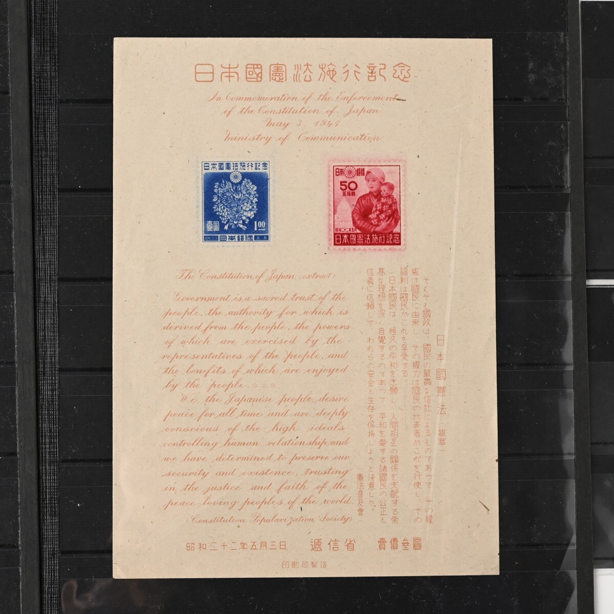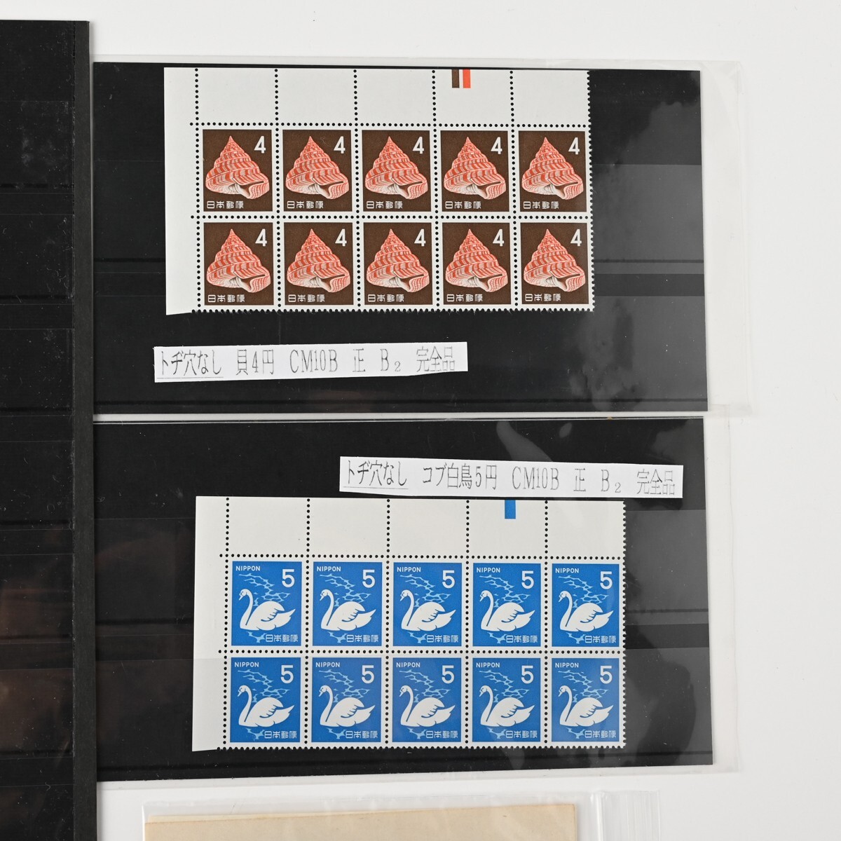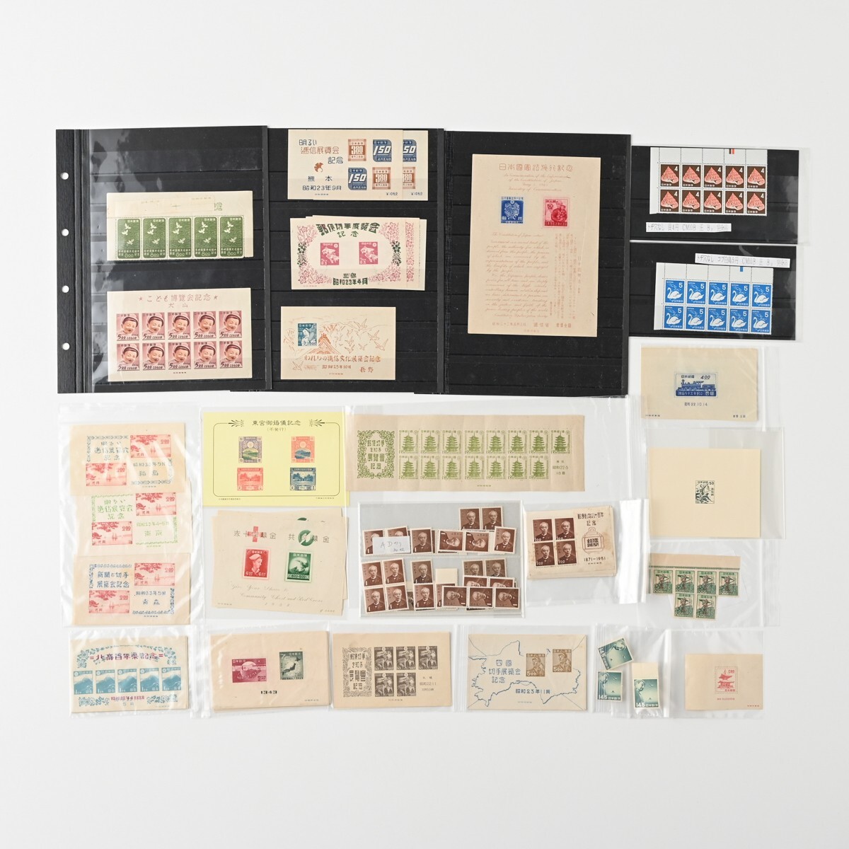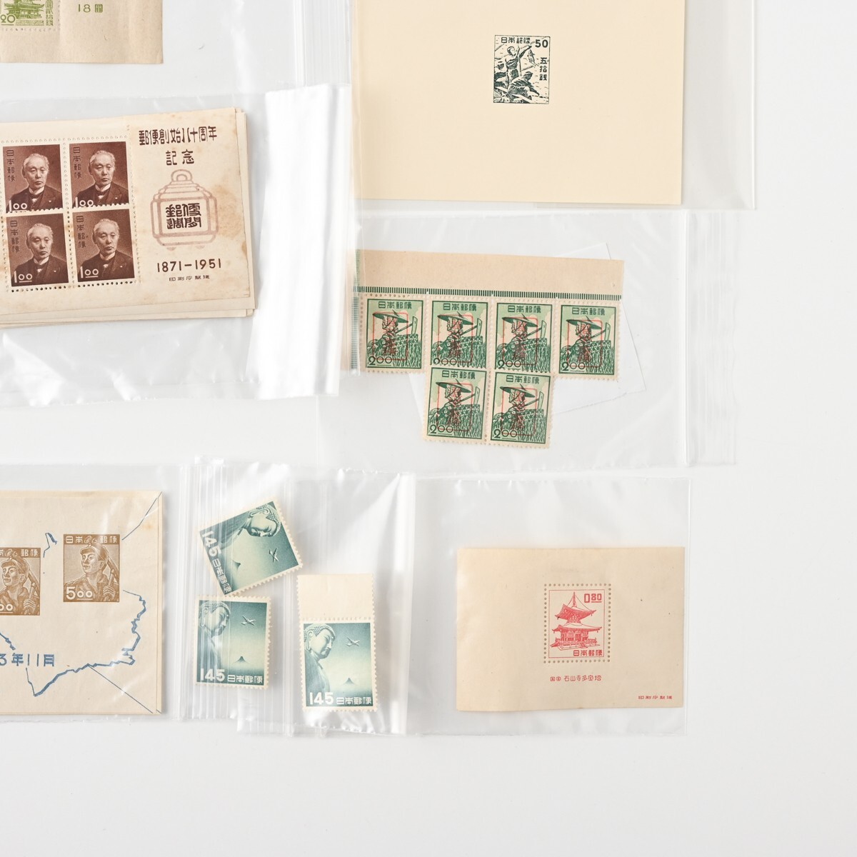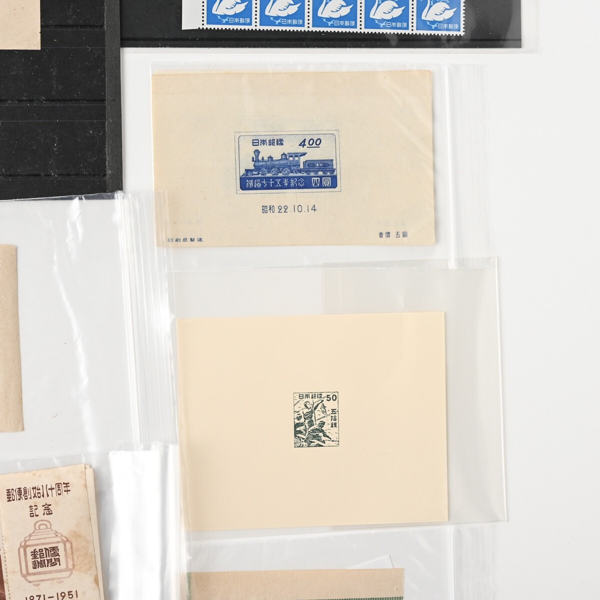カラーマーク(CM)付き切手、記念切手 小型シート ブロック バラなどをまとめた古切手のコレクションです。 整理台紙・透明パック入りで保存されており、全て消印はありません(目視での確認です)。 確認したかぎり内2点、模刻品がございます。 ※経年品・コレクター収集整理品としての出品です。 お譲り受けしたのち、真贋・分類・評価などは専門家による鑑定を受けておりませんので、切手のリストの内容は参考情報としてご覧ください。内容の絶対的な保証はできかねます。 商品の状態(透かし、糊の状態など)については、数が多いため一点一点の確認はしておりません。 写真にて現状をご確認いただき、ご判断をお願いいたします。NCNR前提の現状品でのお渡しとなります。 また、当方専門家ではございませんので、専門的なご質問にはお答えできませんこと、何卒ご容赦ください。 下記、切手の内容リストです。 <未使用>1949年 万国郵便連合 75年記念 小型シート 21枚 <未使用>選挙事務用切手 昭和22年 農夫図 2円 6枚(ブロック) <未使用>昭和 透かし無 国宝 石山寺多宝塔 80銭 小型シート 1枚 <未使用>郵便切手を知る展覧会記念 法隆寺五重塔 1円20銭 15面シート 昭和22年 銘柄付き 1シート <未使用>1948年 赤十字 共同募金 小型シート 4枚 <未使用>航空切手 大仏航空 145円 バラ3枚 <未使用>切手趣味の週間記念 昭和22年 1円 5枚小型シート計7シート(うち2シートは昭和23年北斎百年祭記念品) <未使用他混在>郵便創始80年 前島密 1.00円 1951年 小型シート (未使用シート14枚+使用済シート1枚(2枚切取済)) <未使用>AD糊 前島密 1円 普通切手 田型&バラ 20枚 <未使用>コブハクチョウ 5円 CM10B 正規版B2 とじ穴なし 10枚ブロック <未使用>貝 4円 CM10B 正規版 B2 とじ穴なし 10枚ブロック <未使用>明るい通信展覧会記念 昭和23年 福島 小型シート 1枚 <未使用>明るい通信展覧会記念 昭和23年 東京 小型シート 2枚 <消印有含?>新聞と切手展覧会記念 昭和23年 青森 小型シート 2枚(※うち1枚うっすらと消印跡のような形跡が見えます) <未使用>郵便切手を知る展覧会記念 小型シート 札幌 昭和22年 3枚 <未使用>明るい通信展覧会記念 小型シート 熊本 昭和23年 2枚 <未使用>通信展覧会記念切手 昭和23年 3月 大阪 小型シート 3枚(うち1枚昭和23年4月三島版) <未使用>長崎国際文化都市建設記念 長崎名所と鳩 8円 昭和24年 5枚ブロック(台紙に銘板部分一部貼り付け) <未使用>鉄道75年記念 5円 小型シート 昭和22年 印刷局製造 2枚 <未使用>犬山こども博覧会記念 記念切手 小型シート 1枚 <未使用>四国切手博覧会 記念切手 小型シート 昭和23年 2枚 <未使用>われらの通信文化展覧会記念 昭和23年10月 長野 小型シート 1枚 <未使用>日本国憲法施行記念 切手 小型シート 昭和22年5月3日 1枚 <模刻>東宮御婚儀記念(不発行切手) 1枚 <模刻>不発行切手 かつお釣り 50銭 1枚 状態は写真でご確認ください。 また商品は写真に写っているものが全てです。 ただし、乾電池・電球・比較用の急須や花瓶、家具などを載せている台車、分類用のプラスチックケースなど付属しないものが写っている場合がございます。 付属するか気になるものがあります場合は必ずご入札前にご質問ください。 商品のサイズ・状態説明は原則記載しておりませんので、 写真をよくご覧の上、サイズなど気になる点や不明な点がある場合は入札の前に必ずご質問ください。 特に 機械類・精密機器等は商品説明をよく確認していただき、ご質問・ご入札をお願いいたします。 ※専門外の商品もございますので、お答えできる範囲には限りがあります。