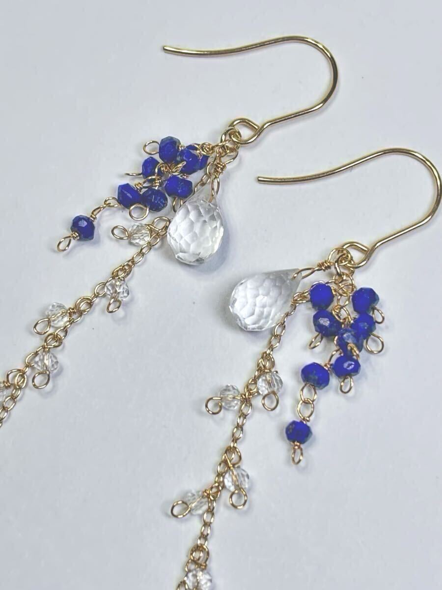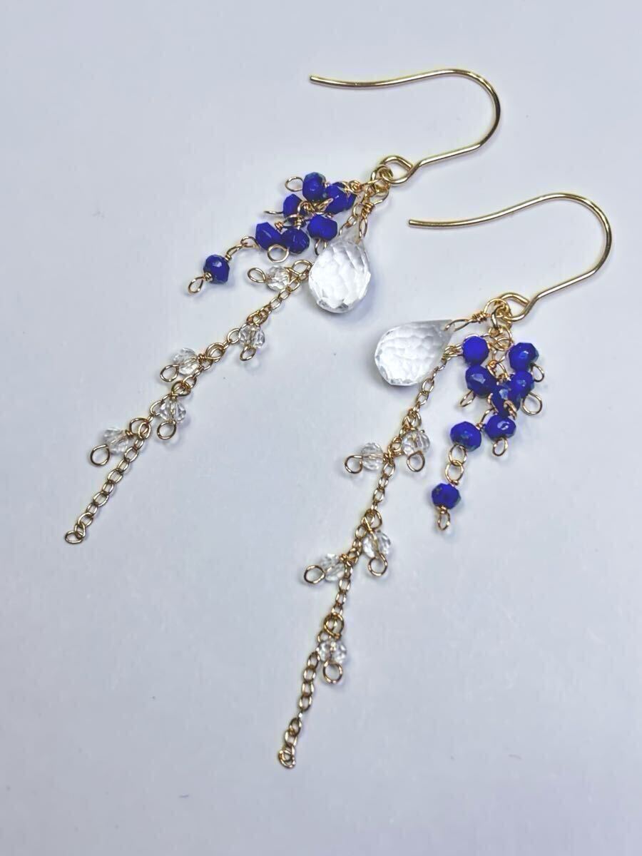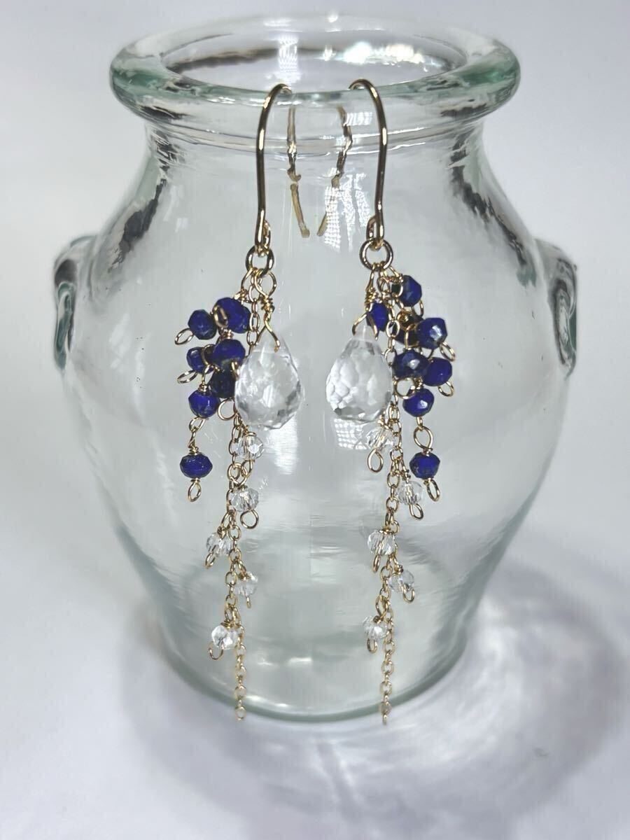 水晶(ブリオレットカット・ボタンカット型)8×5、5・2×2、5mm、ラピスラズリ(ボタンカット型)2×2、5mm、ピアスフックはサージカルステンレス、チェーンと金具は丹銅、ワイヤーは真鍮(ゴールドカラー)