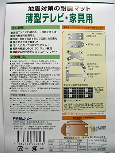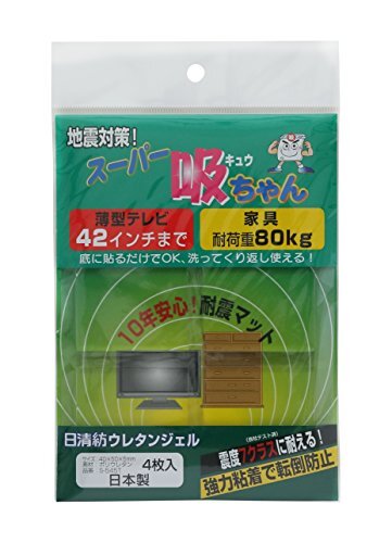 | 商品説明 | 5cm×4cm×0.5cm 4枚入り 薄型テレビ・家具の転倒防止用耐震マットです。 震度7クラスに対応! (自社テスト済) 振動・衝撃も防止するので防音にも効果的! 底に貼るだけで装着OK! 汚れたら洗って何度でも使えます。