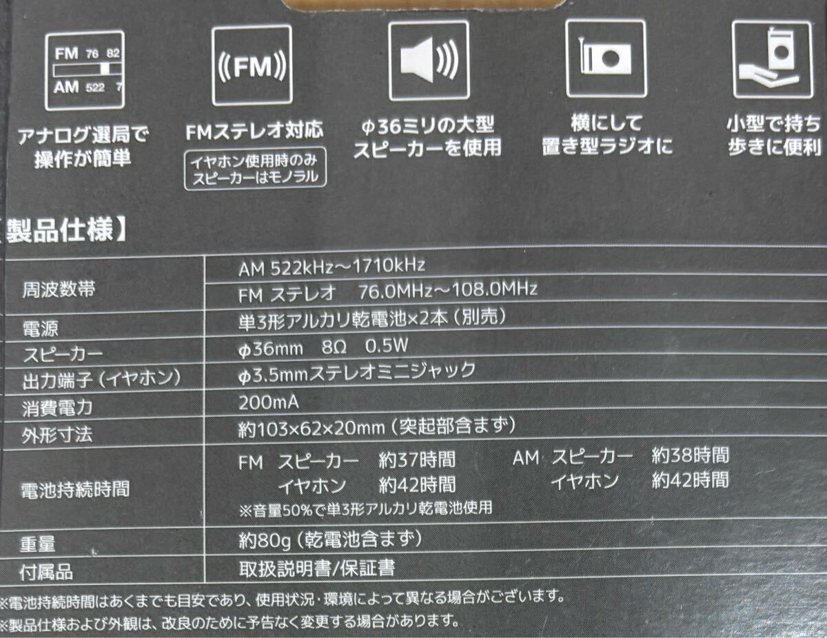 ・イヤホン(別売)使用時はFMステレオ対応ですが、スピーカー使用時はモノラルです。