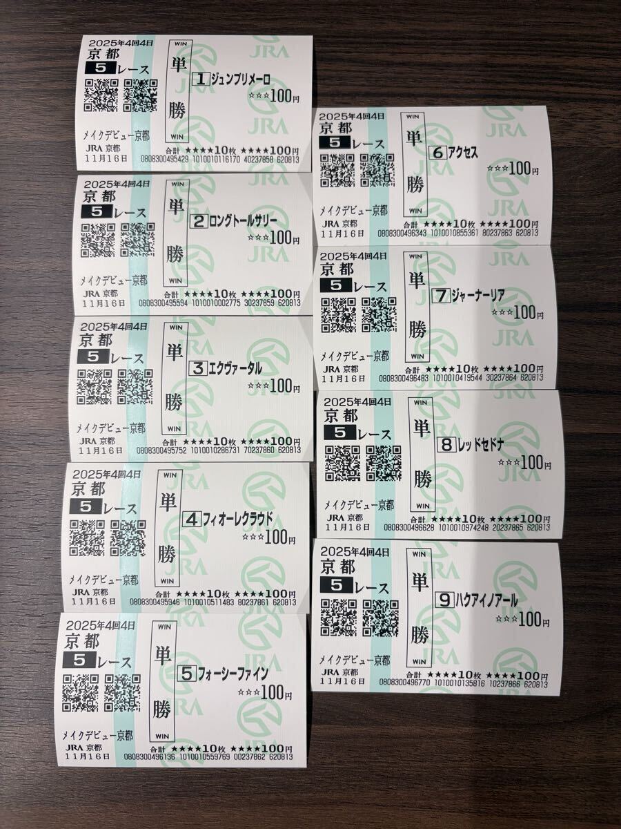 2025年11月6日(日)に京都競馬場で開催された メイクデビュー京都 アクセス を含む現地全馬単勝馬券 計9枚 です。連番購入しました。