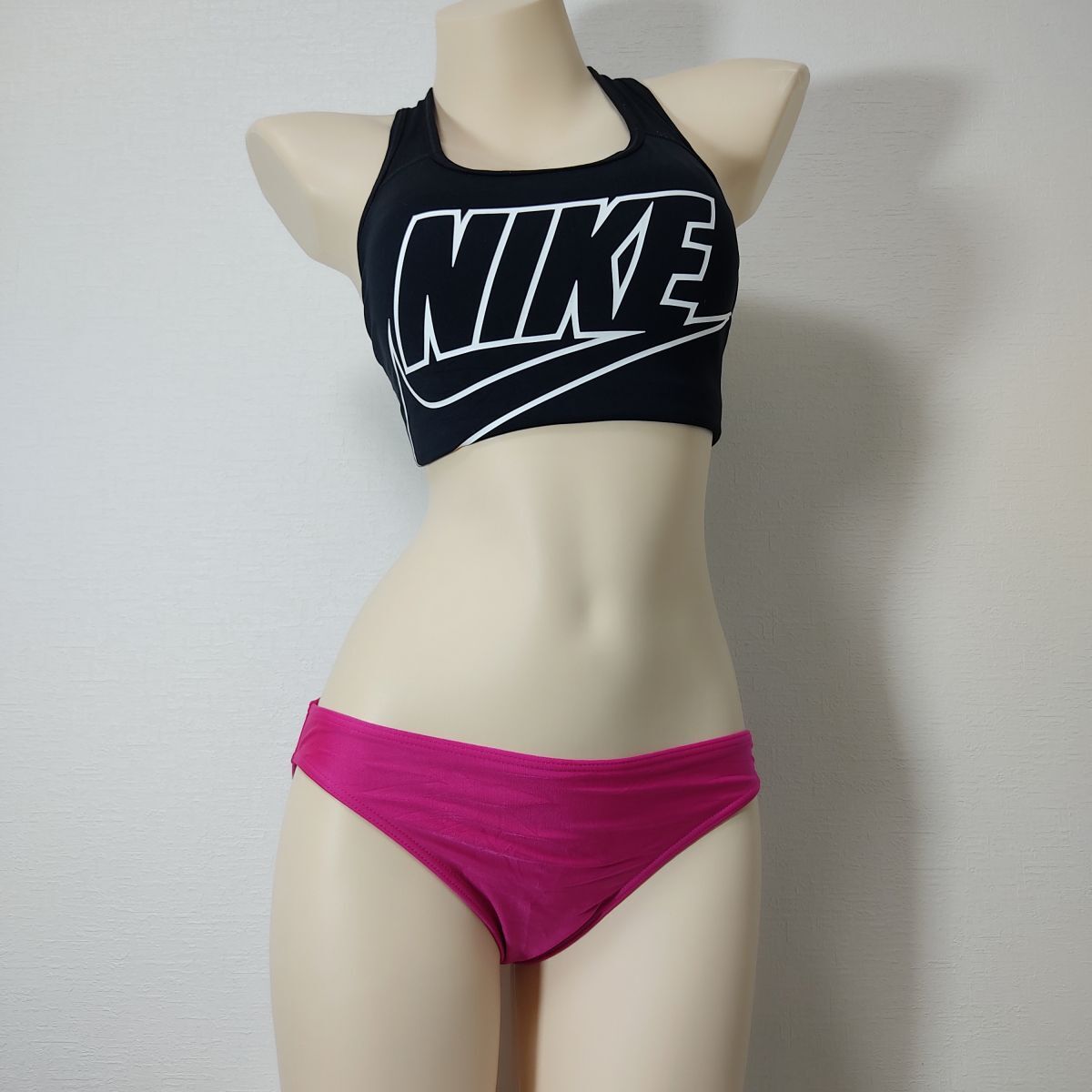32*ナイキNIKE女子陸上レーシングトップL+パンツL程度★光沢ブラック黒ロゴ+ショッキングピンク★伸縮性あり男性も