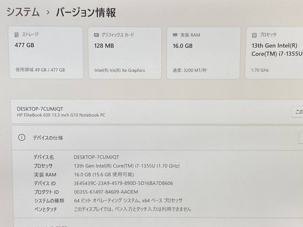 「ジャンク品」HP EliteBook 630 G10 / Core i7-1355U 1.70GHz / メモリ16GB / SSD 512GB / Windows 11Pro