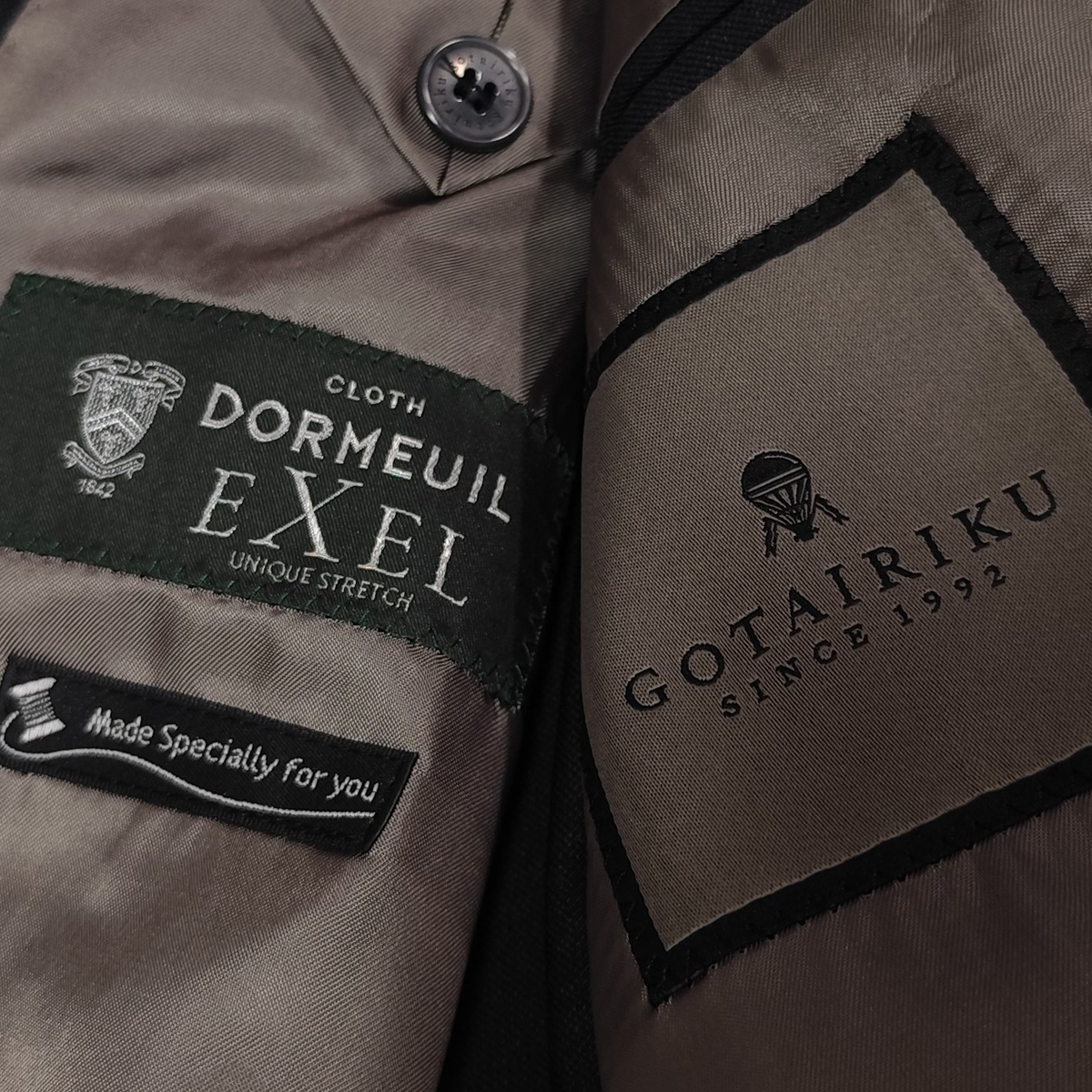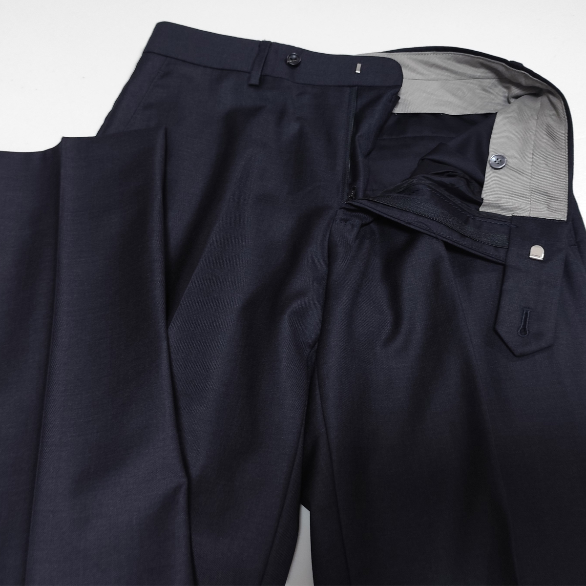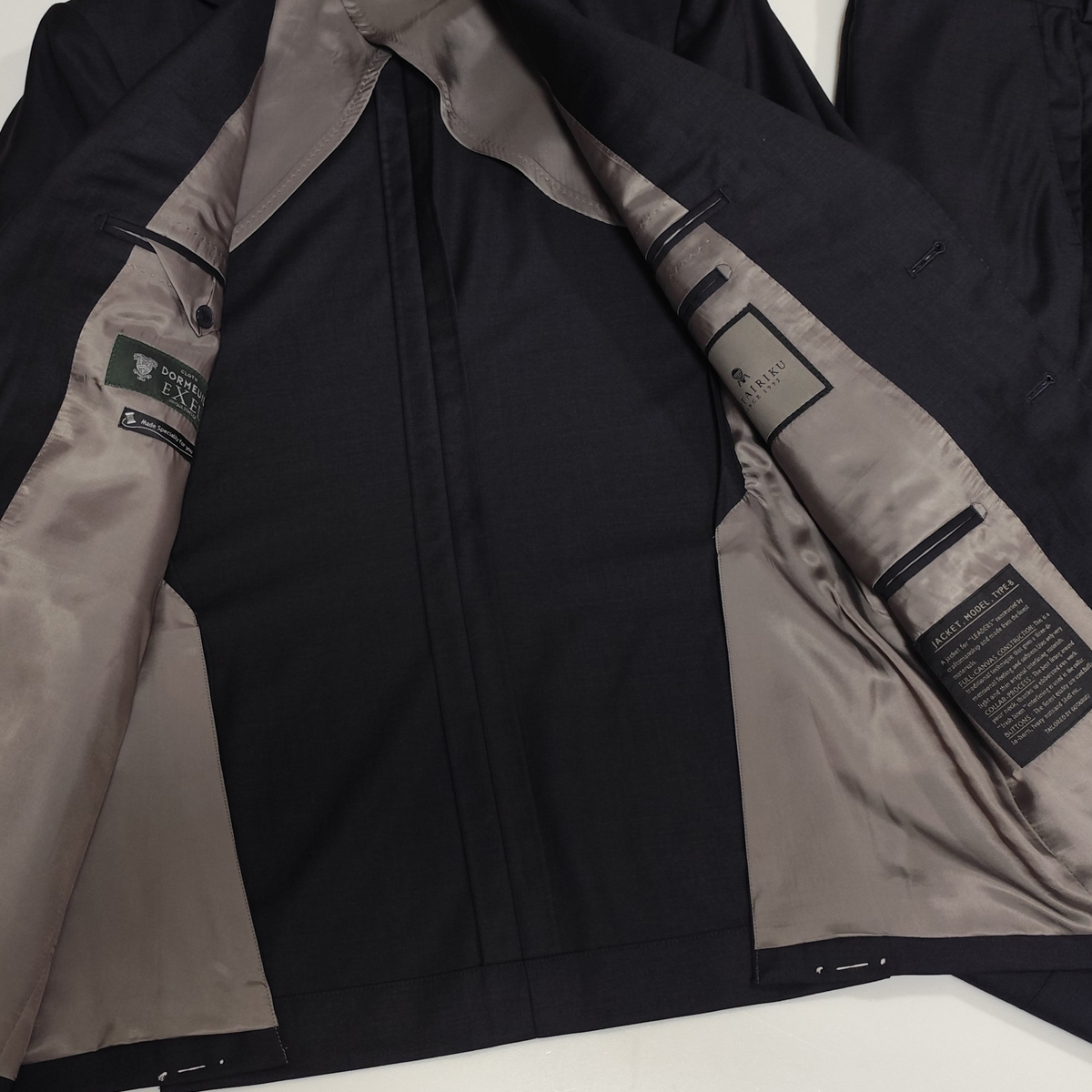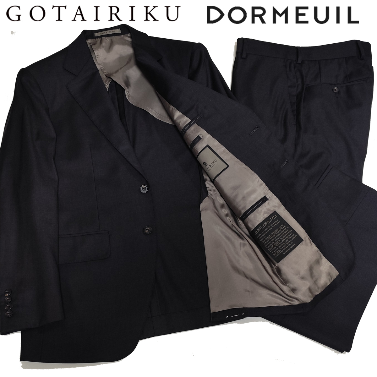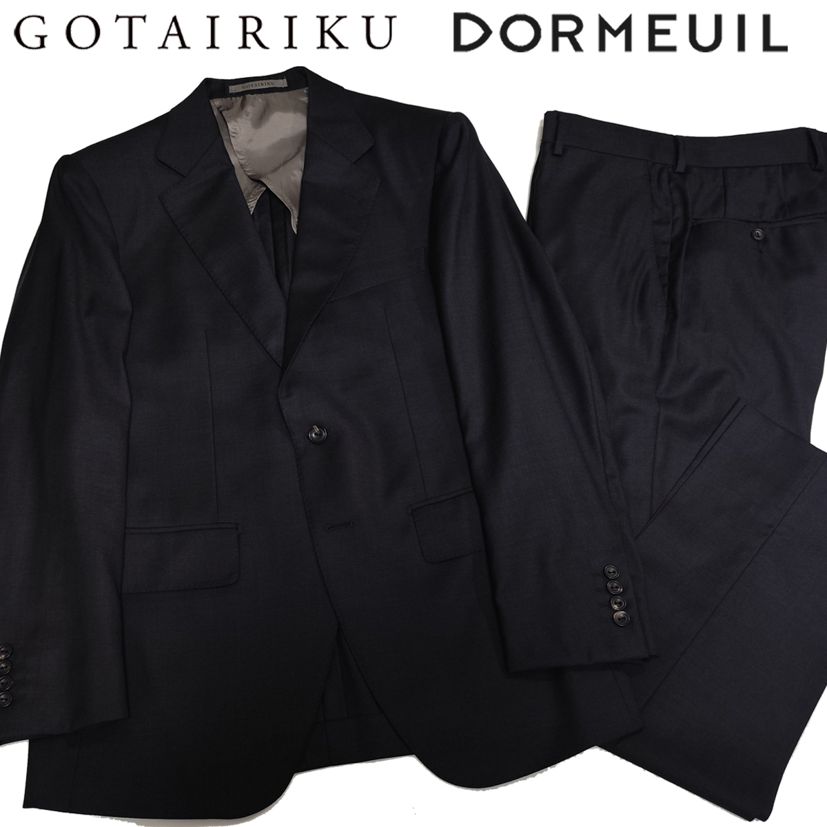 高い縫製技術と丁寧な仕立ての日本製です。ジャケットには、フロントボタン2個、カフスボタン4個。ポケットは外側に胸ポケットを含め3つ、内側に右1つ、左に2つ、ペンホルダー2つ付いています。 サイドベンツ。裏地は背抜き仕立となっています。スラックスは、ウエストあたりをすっきりと見せてくれるノータック仕様。衿は、非常に時間と手間と技術が求められる一枚衿で仕立てています。 DORMEUILは、フランスの高級服地ブランドで、1842年にイギリスから毛織物を輸入し、フランスで販売する服地商として出発したものです。厳選された原毛と英国仕込みのしっかりした織と光沢のあるエレガントな風合いが特徴となっています。その中でもストレッチの快適性を追求した素材使用のラグジュアリーコレクションが「エクセル」です。自然なストレッチ性があり着心地は抜群です。ウール100%で、ハリコシのあるしっかりとした生地。抜群の風合いと光沢感でしわにもなりにくい生地です。つやと光沢が高級感を漂わせていて一目で上質さが分かります。上品でエレガントな印象の一着です。ビジネスシーンはもちろん、様々なシーンで活躍していただけます。 | ||||
