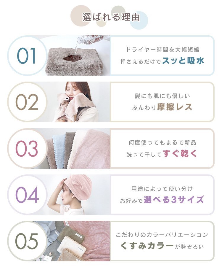 \ 時短・節電・美髪ケアがこれ1枚で! / ふわもちの極上吸水ヘアドライタオルで、濡れ髪ダメージを最小限に! お風呂上がりも夏のドライヤー暑さ問題も解決! ■綿の約5倍の吸水力でドライヤー時短! ■髪にも肌にも優しい、ふんわり摩擦レス仕様 ■速乾&高耐久で毎日使っても新品級! ■こだわりのカラバリ! 子育て中のママにも嬉しい速乾&清潔仕様♪ サウナやレジャーへの持ち運びタオルとしても◎ 【商品仕様】 カラー:グレージュ ※ビッグサイズは1枚ずつの販売です サイズ:ビッグサイズ(約)60×120cm 素材:ポリエステル85% ナイロン15% 【注意事項】 ・繊維製品の性質上、初回お洗濯時は繊維くずが落ちる場合がございます。 2回目以降のお洗濯から抜け落ちは減っていきますので、予めご了承ください。 ・商品は、モニターによって色合いが異なって見える場合があります。 ・仕様・デザインは改良のため予告なく変更することがあります。 ※もちろん新品未使用品です 商品コード:DTW003GG ▼検索ワード タオルキャップ ドライキャップ 高品質 柔らかい やさしい シンプル カラータオル さらさらヘア うる艶 さら艶 おすすめ 美髪 ヘアケア 美容 枝毛 切れ毛 ダメージケア ショート ロング セミロング 髪の潤いを逃がさない 寝ている間にヘアケア 髪のお悩み 寝ぐせ パサつき うねり ロングフェイスタオル トリートメント効果 頭皮を保湿 手洗い 部屋干し コンパクト ミニマリスト 一人暮らし 下宿 サウナ スポーツ |