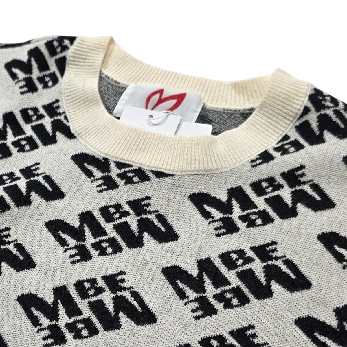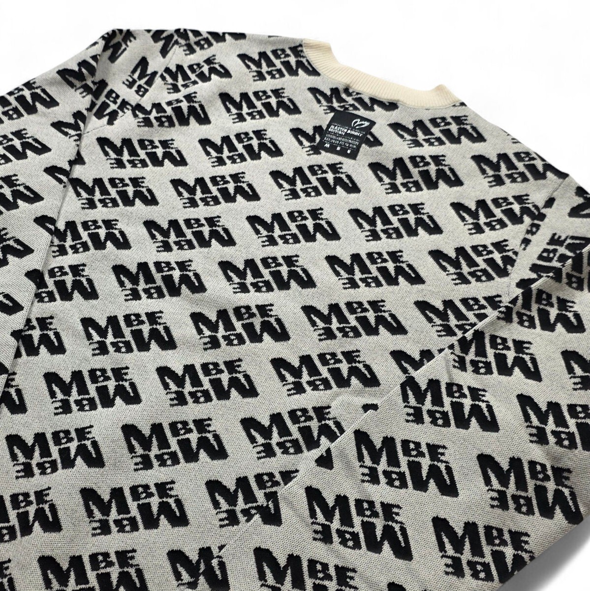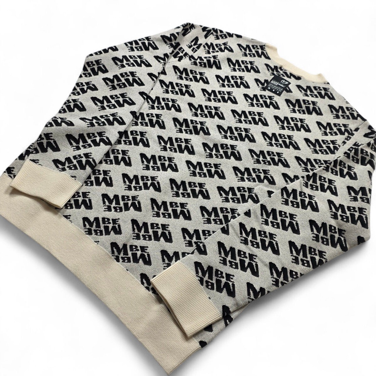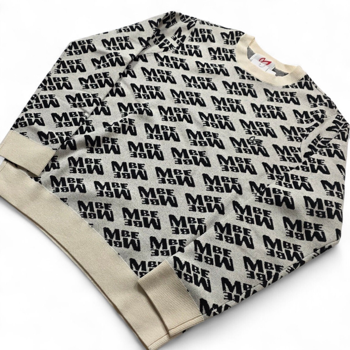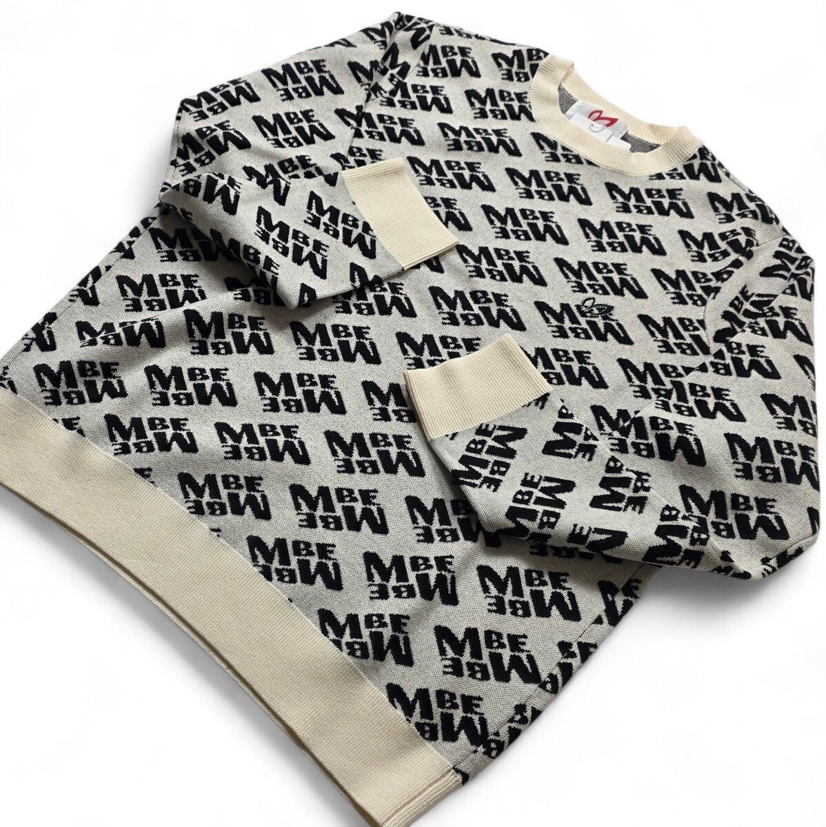 レイアウトやサイズに遊び心を感じるバイヤスロゴを総柄で表現した、MBEロゴ柄のウールクルーネックニットプルオーバー。