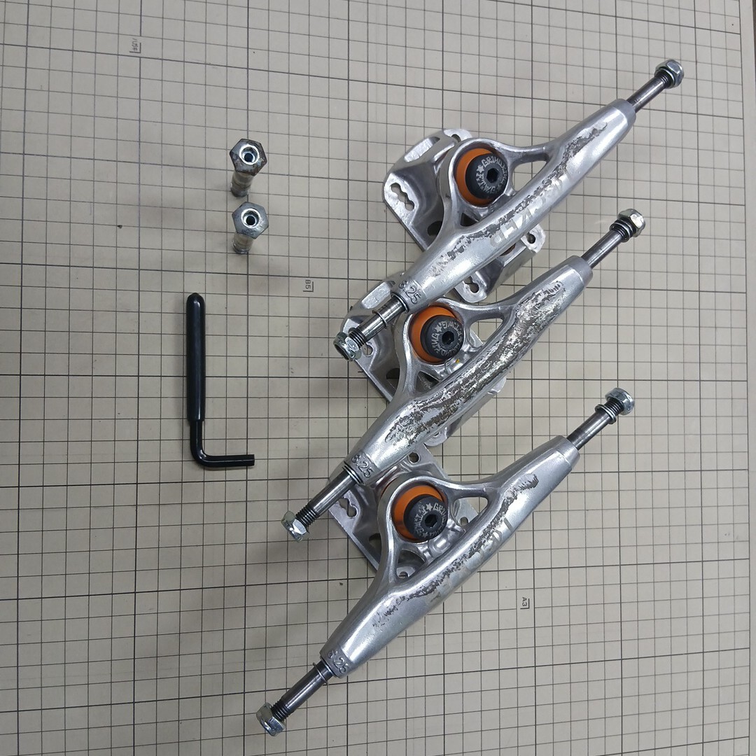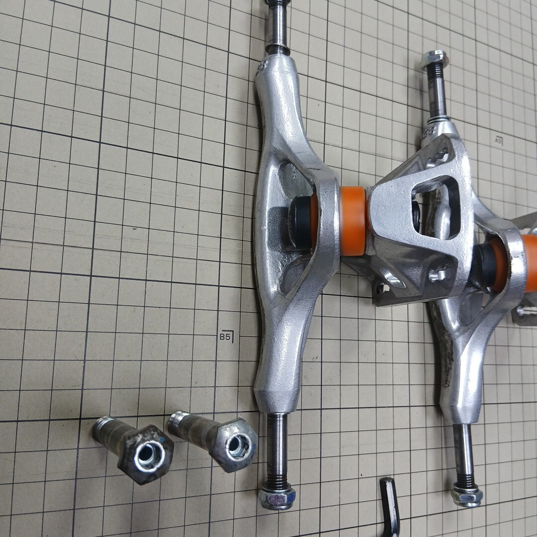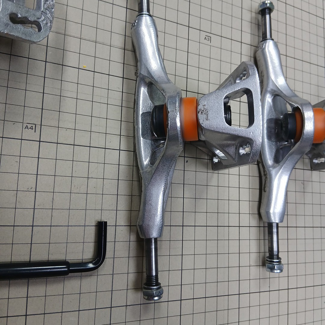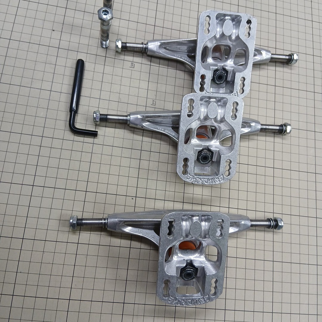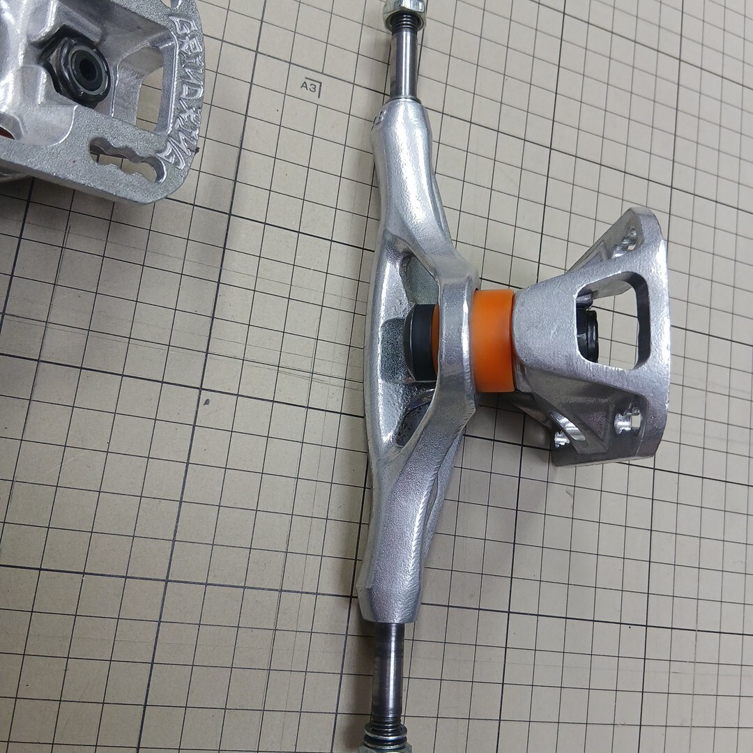 インディペンデントスタンダードより15%軽量(チタン同様)、インバートキングピン、ノーマルブッシュで4タイプのセッティング、バイトしにくい、ウィールベース移動可能、アクスルシャフトU字型デッキ寄り、ワイドベースプレートで乗り心地着地軽減、ロック式ハンガー形状など。