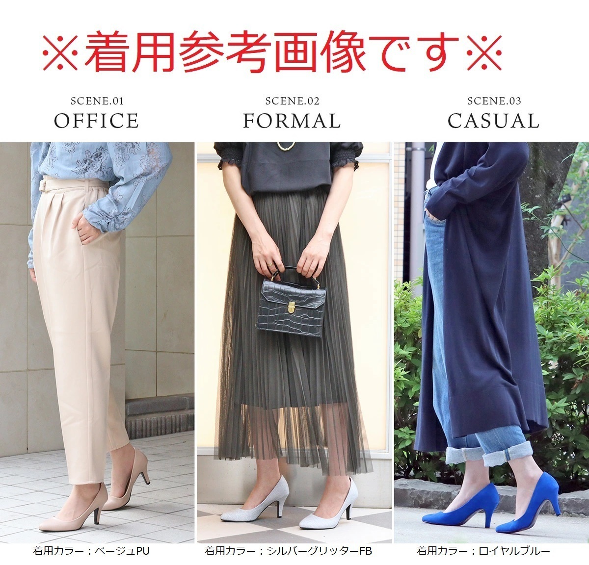 メーカー累計販売足数20万足突破! 【LiBERTYDOLL リバティードール】の8cmヒールパンプス。 脚を長く綺麗に見せる8cmヒール。膝下が長くなり、背筋も伸びて美脚とスタイルアップを叶えます。 つま先は尖りすぎず、丸過ぎない、程良いポインテッドトゥ。 衝撃を吸収する"もちもちクッション"がインソール全面に使用されており、指の付け根やつま先を優しく包みます。 かかとパッドは靴擦れを防止。パッドがあることで甲浅デザインでも靴脱げしにくいです。 靴底にはグリップ力の高い素材を使用。滑りにくく、安心してお履きいただけます。 |