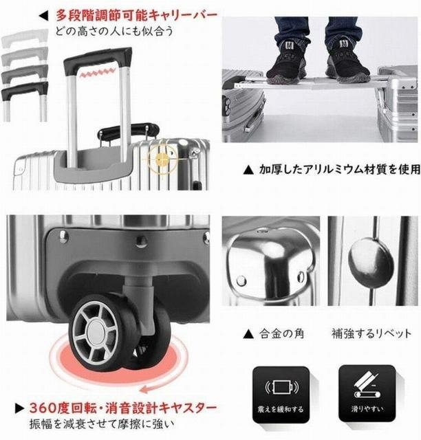 【多段階キャリーバーとキャスター】 旅行箱は身長や状況に応じて自由に長さを調節できます。自分に似合う高さをボタンで調節します。レディ―スにもメンズにも十分にピッタリです。 キャスターは360度自由回転できると同時に静音効果がはっきりしています。 4輪ダブルキャスターが備えられています。