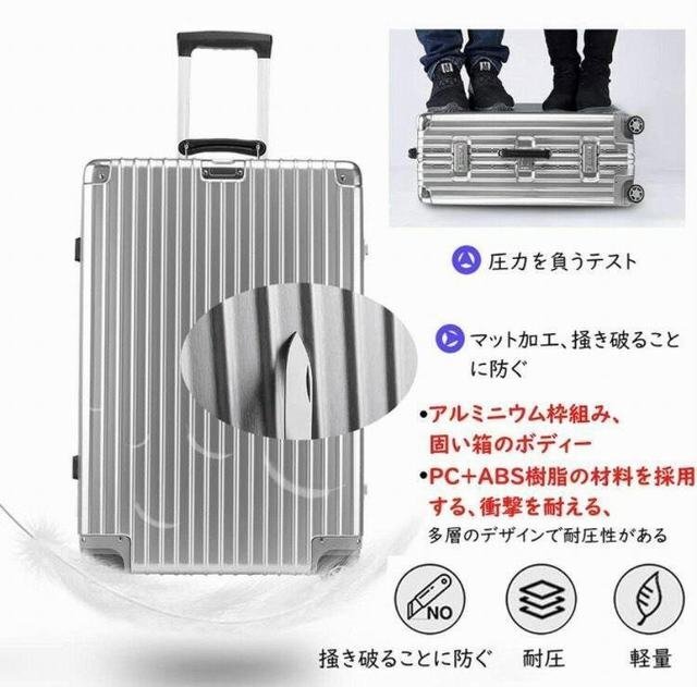 【サイズ】 外寸:約55.3*24.3*38.5cm 内寸:約34*23.3*49cm 容量:38リットル 【注意事項】: 一部の航空会社には機内持込不可です。 細かいデザインはメーカー出荷ロットにより変わる可能性がございます。 海外製インポート品のため,日本語説明書は付属しておりません。 【材料】 トランクはABSとPCの混合素材を採用します、軽くて衝撃に強いです。 そしてりょこバッグの表面にはヘアライン仕上げがされましたので、傷を防ぐ方には役立ちます。超軽量ですから海外のトラベルやビジネス出張に便利です。