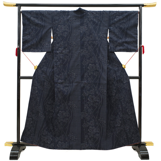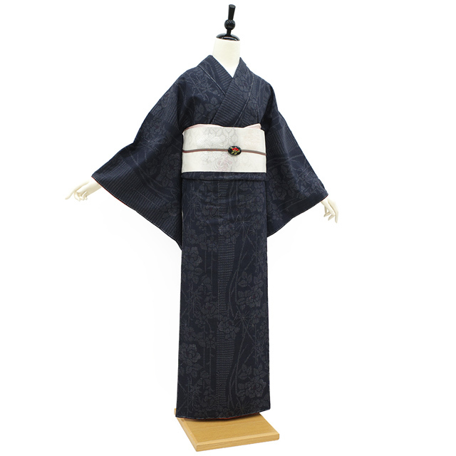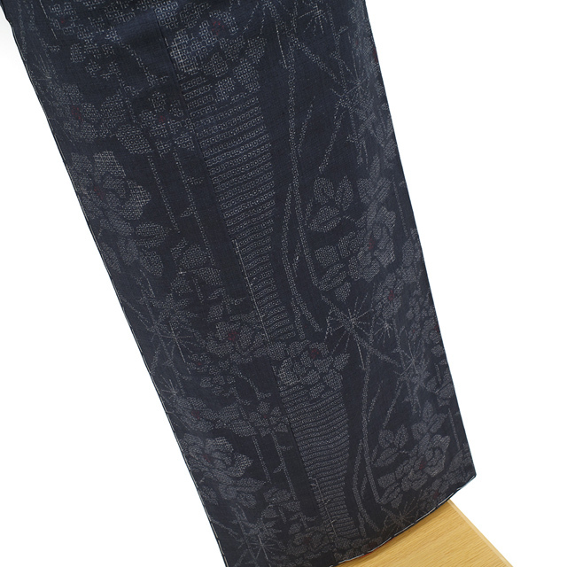こちらの結城紬は、濃グレーのシックな地色に、流線状のバラの花が上品に織り上げられています。