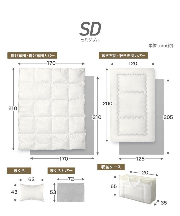 | ISO9001認可工場で生産された安心の品質! 届いてすぐ使える寝具6点+収納ケースの7点セットです。 掛け布団は高級布団などにも使われるフェザーを100%使用! 冬場は暖かく、夏場は蒸し暑くなりにくいため、オールシーズン快適に過ごせます。 敷き布団はフローリングや畳の上に直接敷いても痛くないよう、 芯のある固綿を、ふんわり柔らかな中空ポリエステル綿でサンドイッチした三層式構造を採用! 底付き感を感じないボリュームで、快適な寝心地とふんわり優しく包みこまれる気持ちよさを実現! また、抗菌防臭加工が施されており、いつでも清潔に使えます。 \すぐ使えるから、こんな方におススメ♪/ ・一人暮らしや新生活を始める方 ・新生活を始める方 ・来客者用の布団一式を考える方 ・布団、寝具の買い替えを考える方 ・社員寮など業務用として考える方 【商品内容】 掛け布団、敷き布団、まくら、掛け布団カバー、敷き布団カバー、まくらカバー、収納ケース 【商品詳細】 カラー:チェックグレー サイズ:セミダブル(詳細は画像参照) 素材:ポリエステル、フェザー |