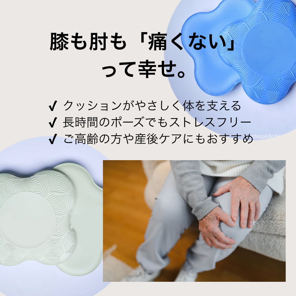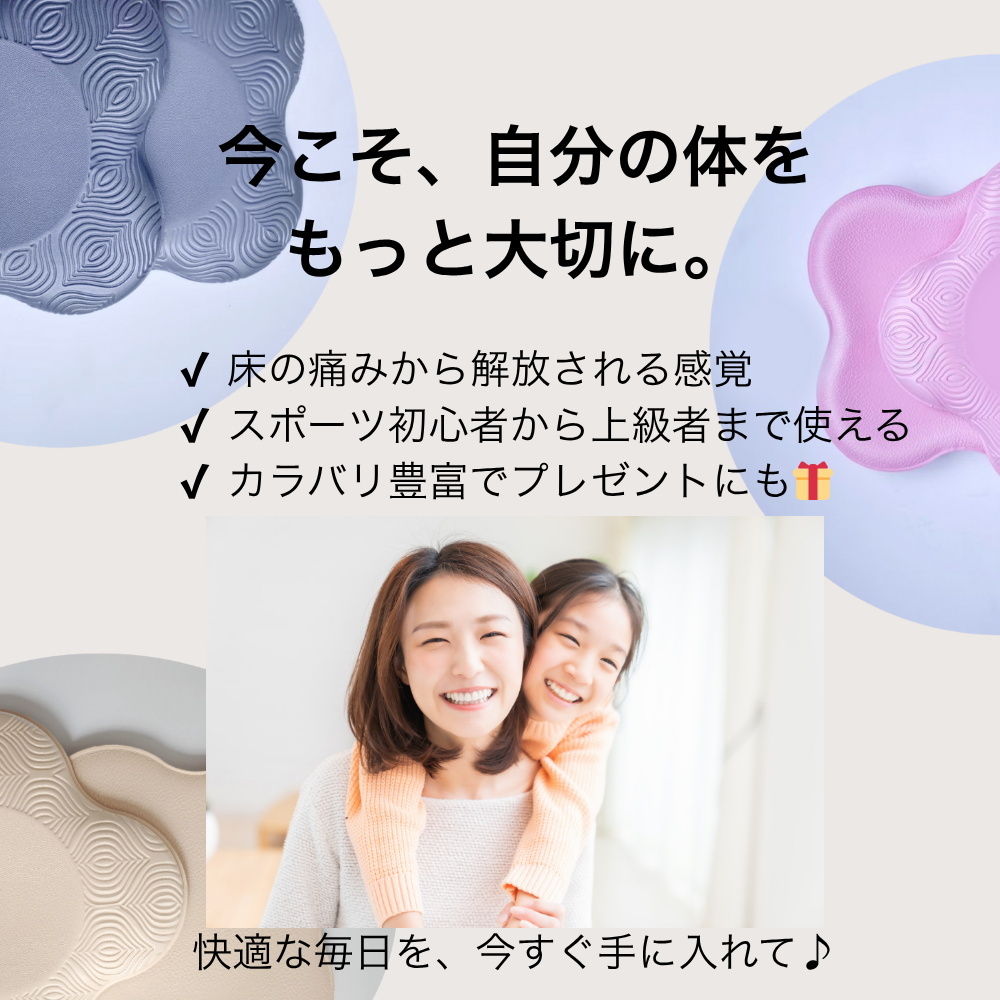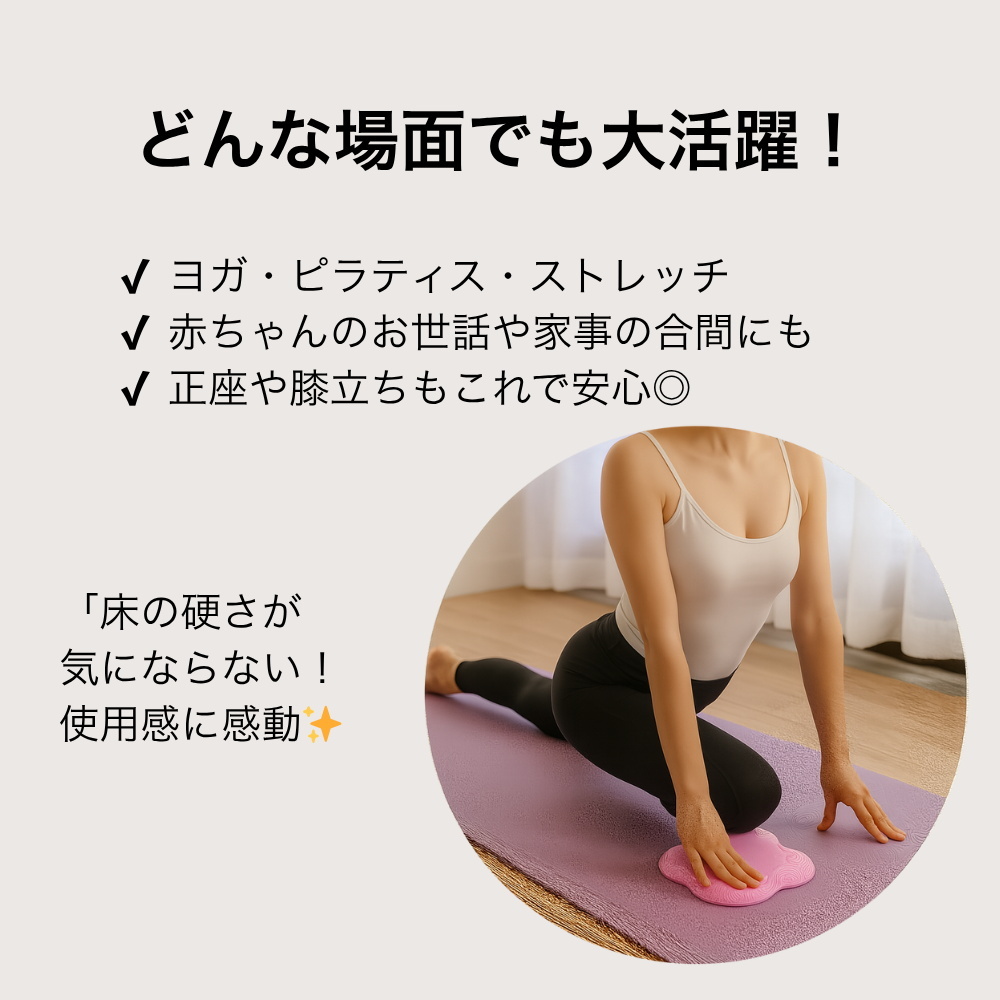本製品はヨガやピラティス、フィットネストレーニングなどさまざまなエクササイズに対応。プランク、腹筋、四つん這いポーズ、ランジ、ストレッチにも適しており、膝や肘以外にも負担がかかりやすい腰回りや座骨のサポートにも活用できます。トレーニング以外にも、床座での家事や育児時の膝立ちシーン、子どもと一緒に遊ぶ時間、瞑想や読書などゆっくり座りたい場面にも対応。運動用と日常用、どちらの目的にも自然に使える便利さが特長です。