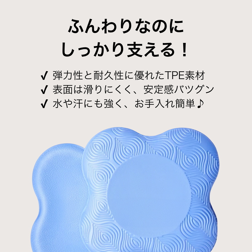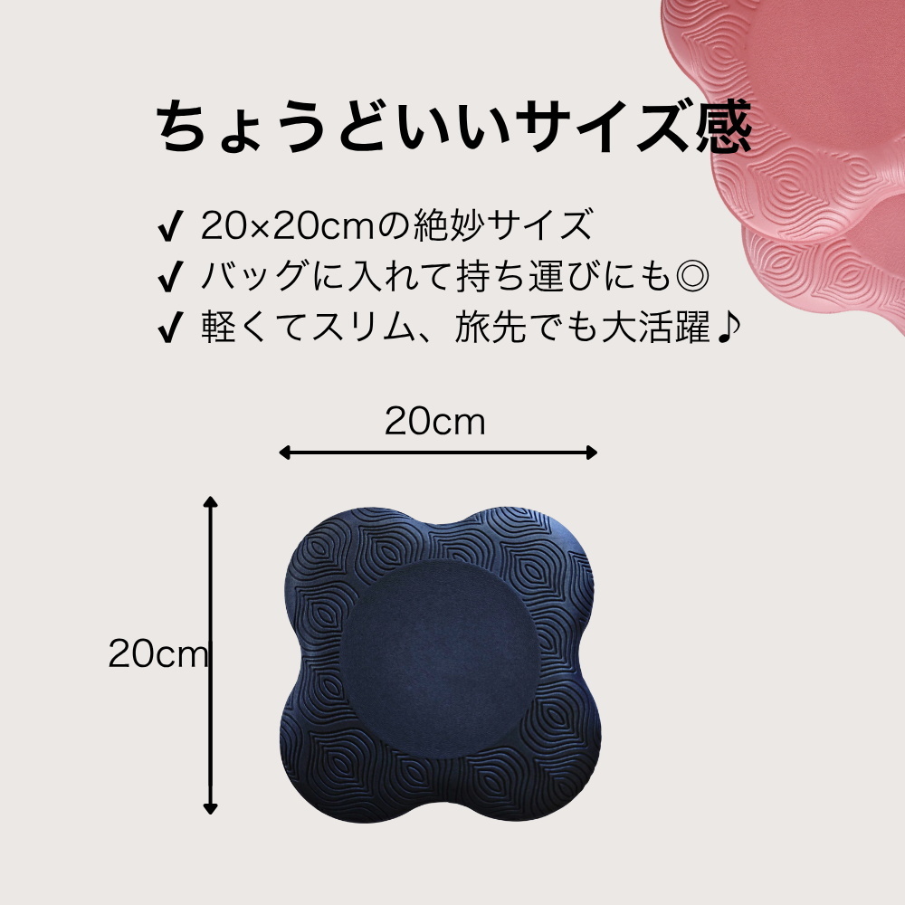 厚さ2cmのクッション構造は柔らかい触感で体にフィットしながら、体重がかかっても沈み込みすぎず安定感をキープ。ポーズ中にバランスを整えやすく、フォームを作る時間をしっかり確保できます。表と裏には凹凸加工を施しており、ヨガマットや床との密着性を高めて滑りにくくすることで、集中力を妨げない作りとなっています。