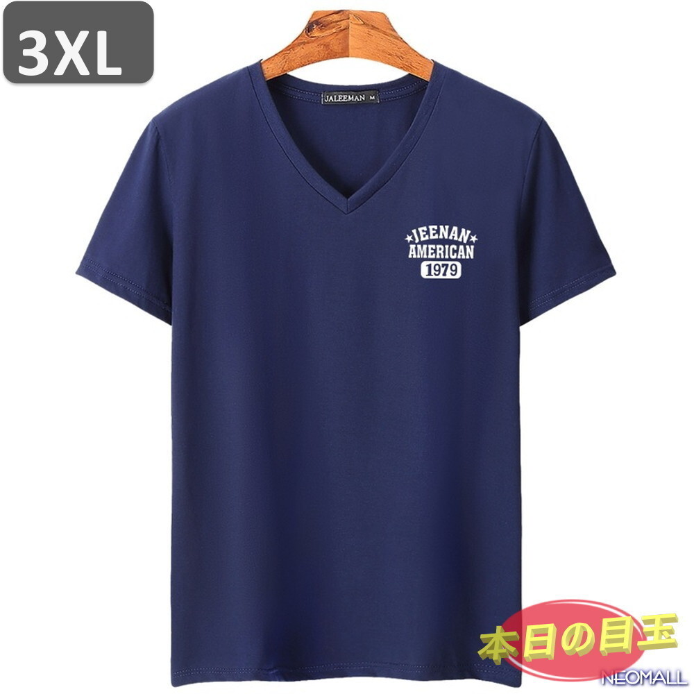 本日のお買得 ☆ Vネック 半袖 Tシャツ【453】 ネイビー 3XLサイズ トップス シャツ シンプル イラスト デザイン 春夏