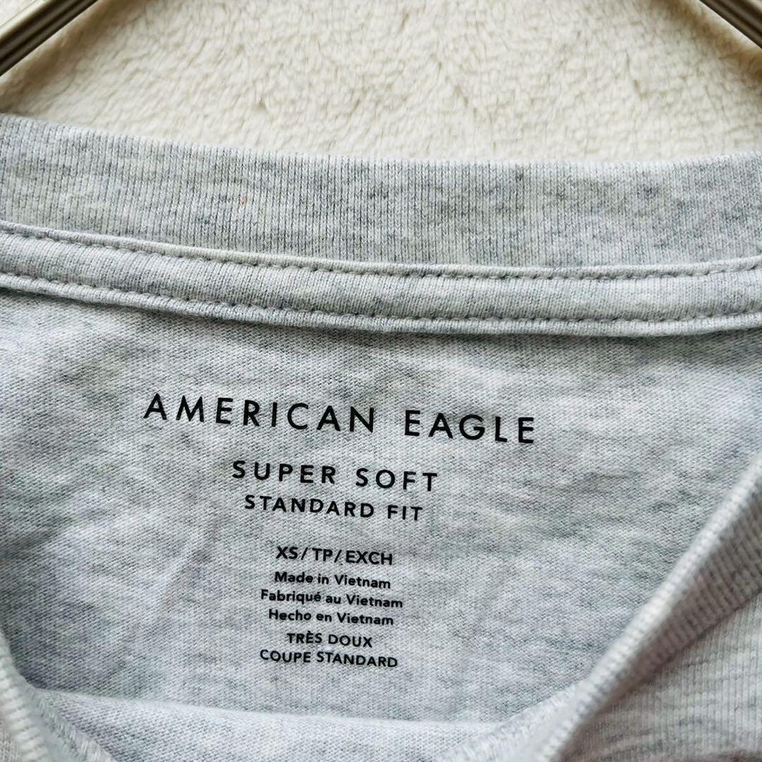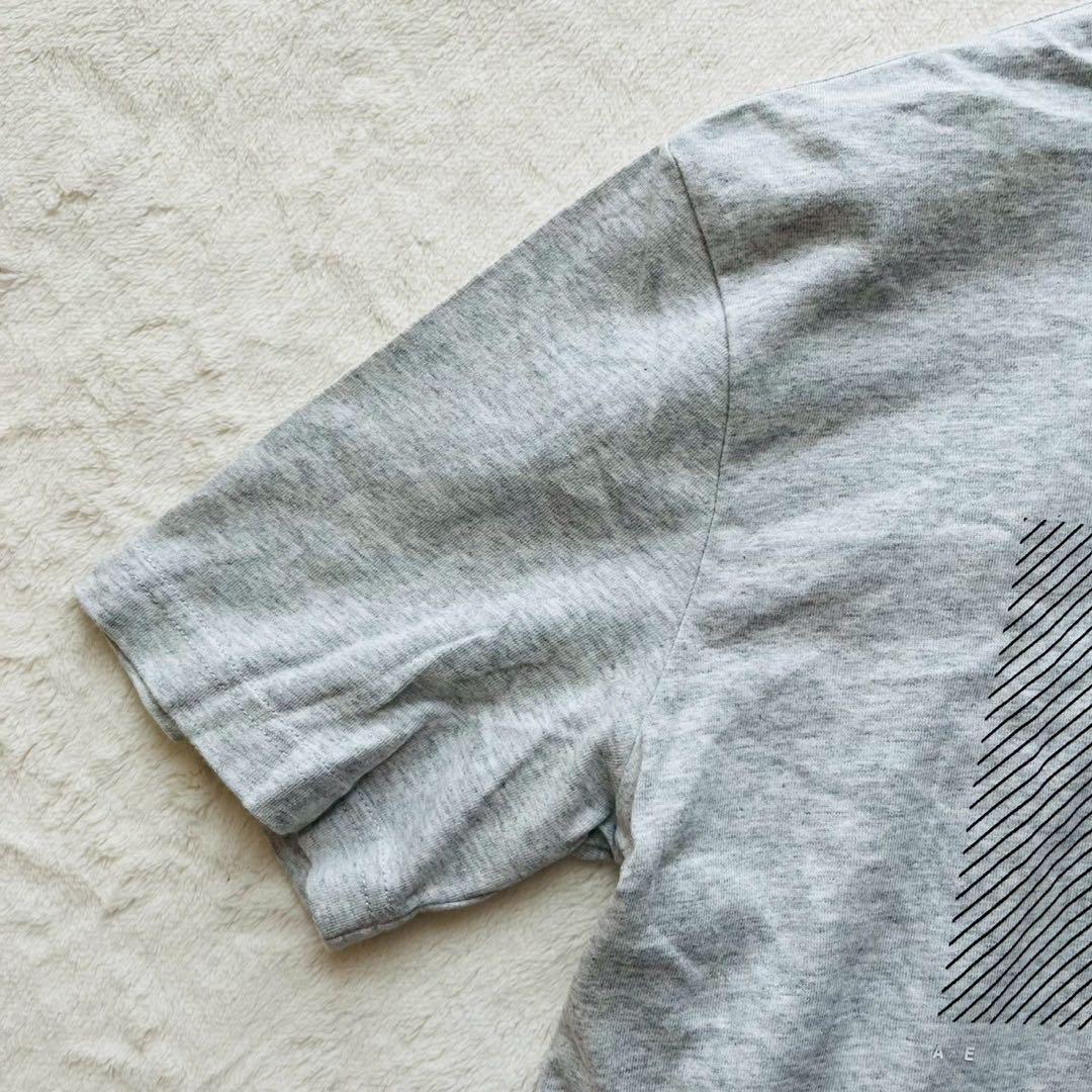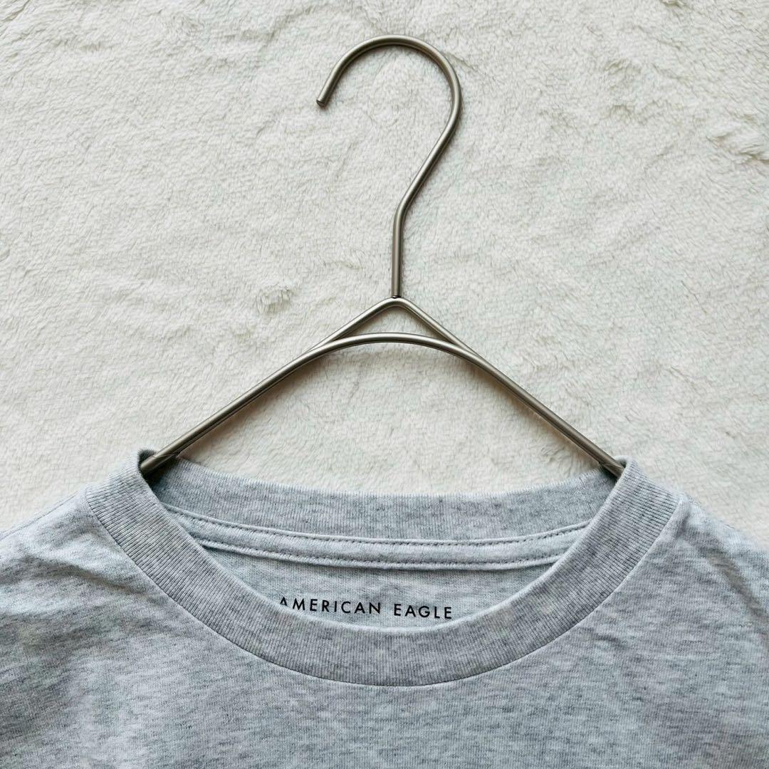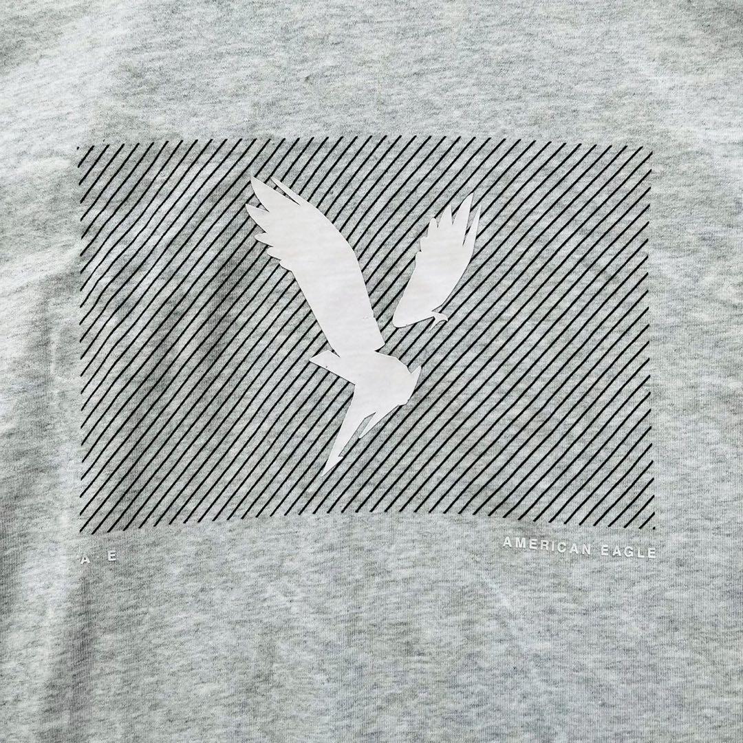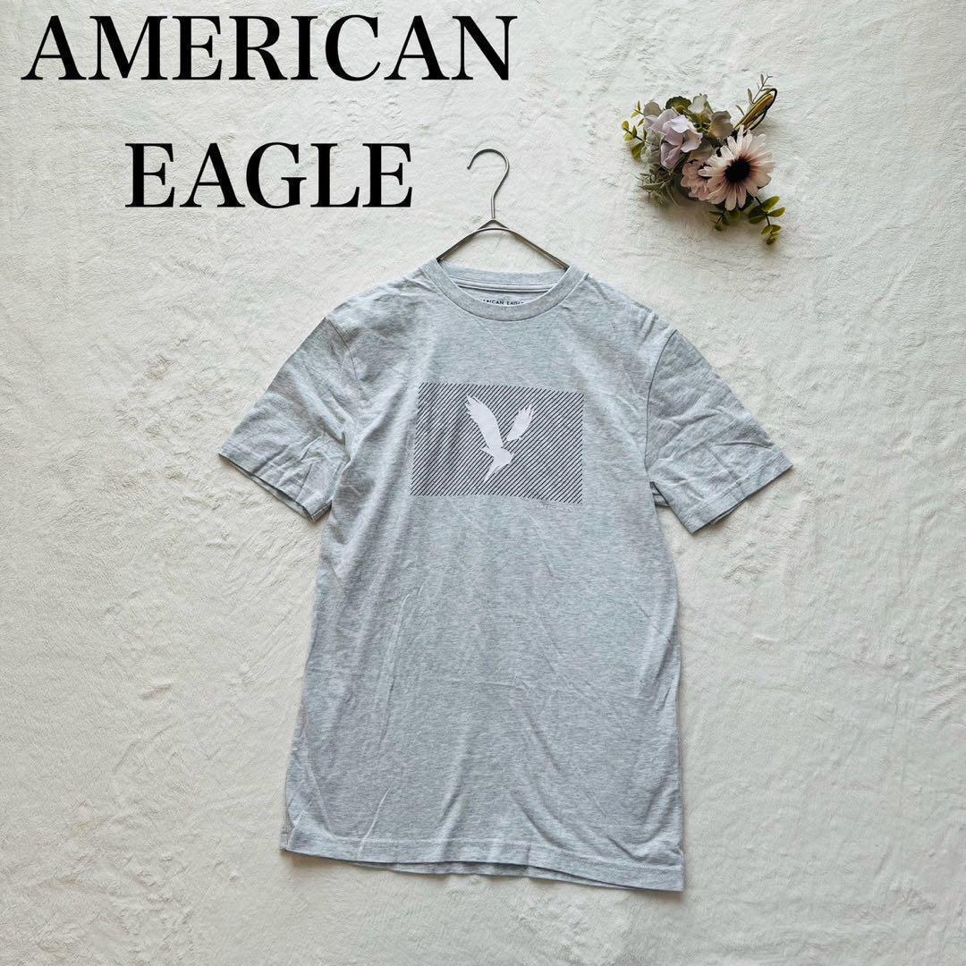 グレーのコットンTシャツ、AMERICAN EAGLEのロゴプリント入り。