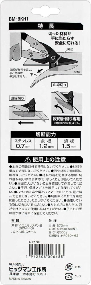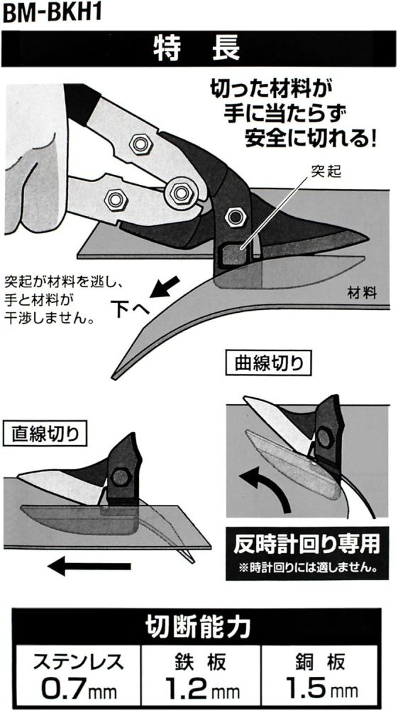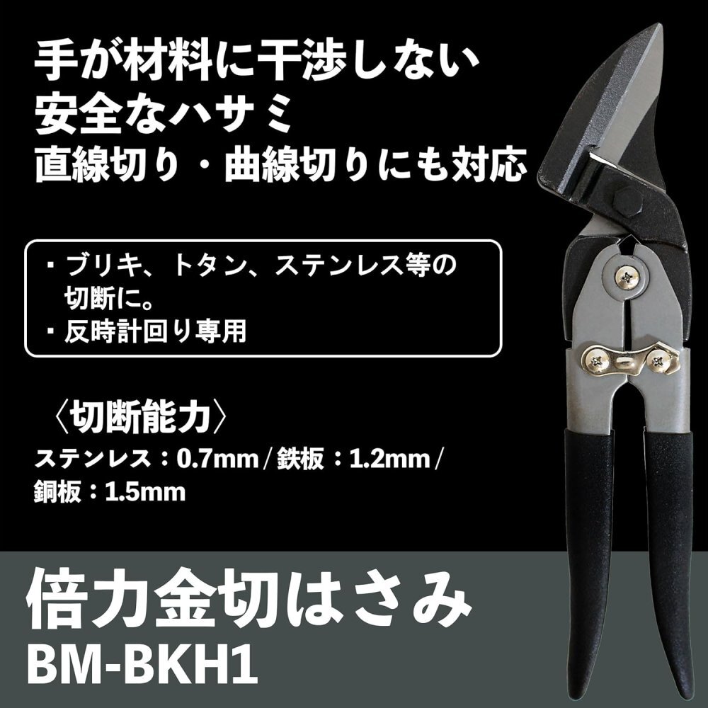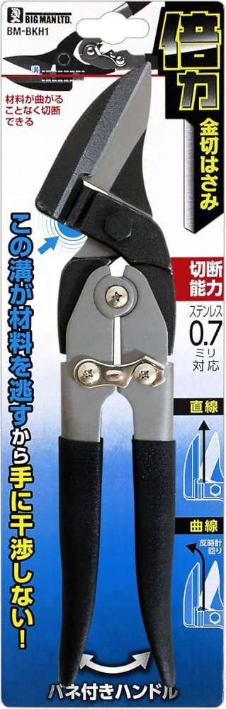 「商品状態」【新品アウトレット】☆外箱に若干傷みがございますが、中身に一切支障はございません。新品、在庫限りです。☆迅速に発送致しますので安心・安全にお買い物頂けます。☆迅速・丁寧に発送致します。☆最後までお読み頂きありがとうございました。 ☆We always ship quickly with domestic shipping. ☆We will ship promptly and carefully. ☆Thank you for reading to the end.「商品情報 (新品の場合) 」[特徴] ●倍力機構搭載、バネ付ハンドルで少ない力で楽に切れます。 ●ステンレス0.7mm厚対応。しっかり切れます。 ●オフセットした刃により、切った材料が手に当たらず安全に切断作業を行えます。下刃の根元側のくぼみが切断した材料を下方向に逃がし、手と材料が干渉しません。 ●直線切りも曲線切り(反時計回り専用)も可能です。 [用途] ●ブリキ、トタン、ガルバリウム鋼板、ステンレス、アルミ板など金属板の切断に。 [切断能力] ●ステンレス