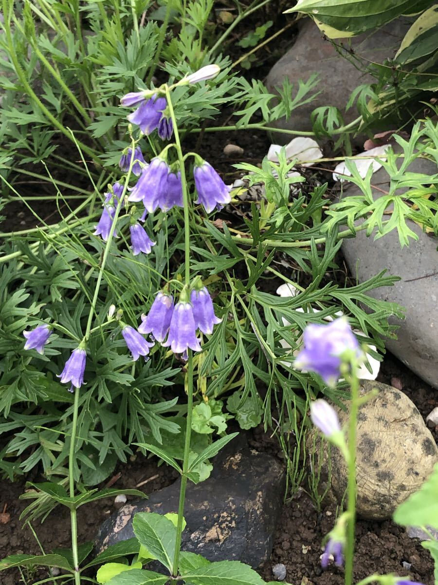 花:釣鐘状で、淡い青紫色や白の花を下向きに複数咲かせます。