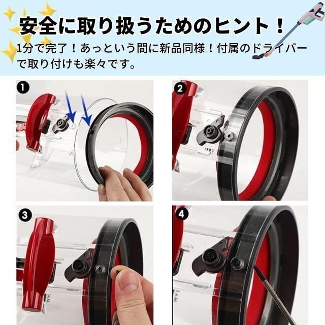 経年劣化しやすい“赤いトップシール”を高耐久シリコーン素材で再現。純正同等のフィット感で微細な粉じん漏れを防ぎ、吸引力をリフレッシュします。付属ドライバーだけで 3〜5 分ほどの簡単交換が可能です。