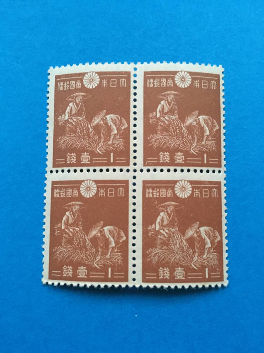 C343 第一次昭和 1次昭和 稲刈り 1銭 田形4枚ブロック