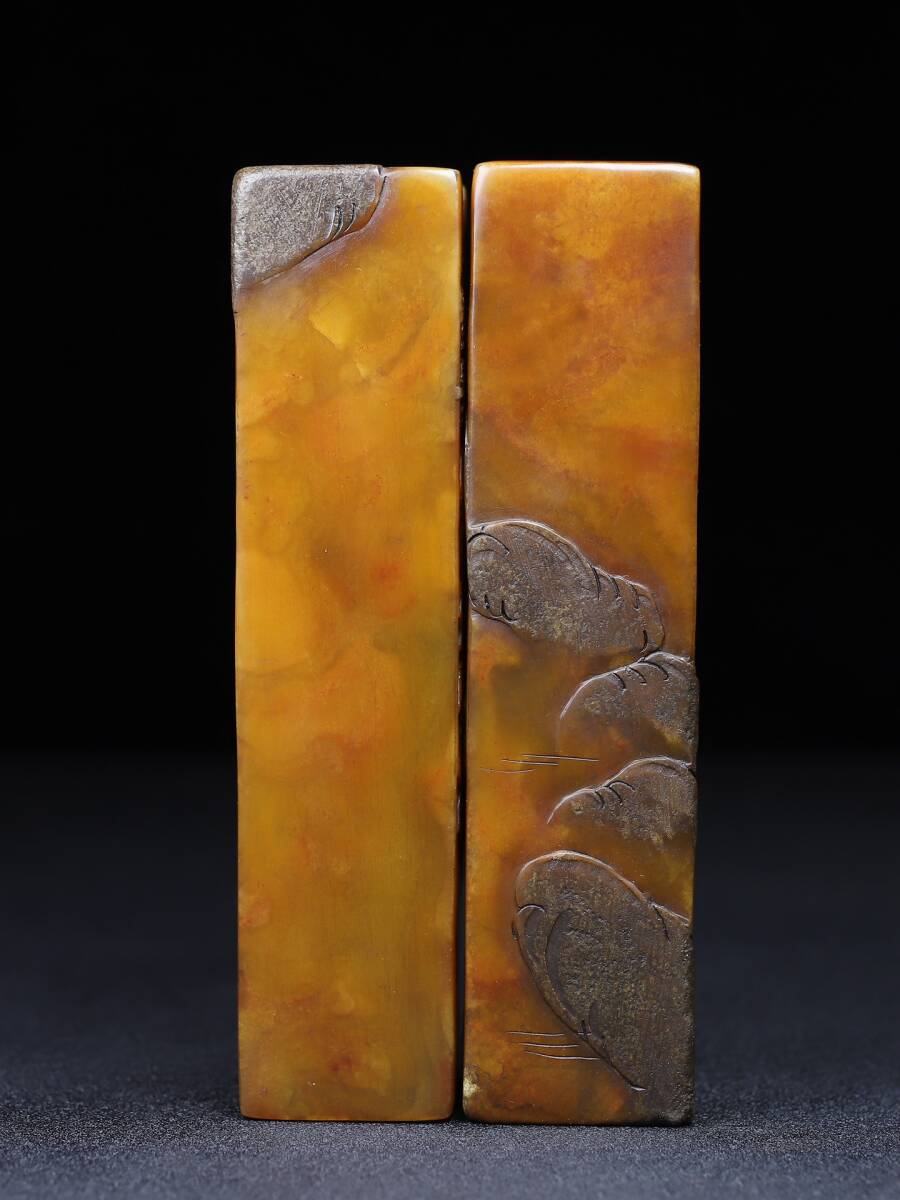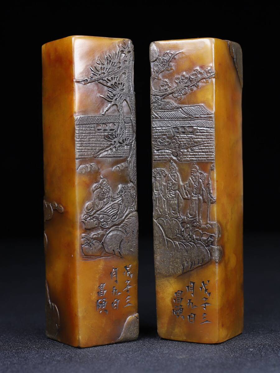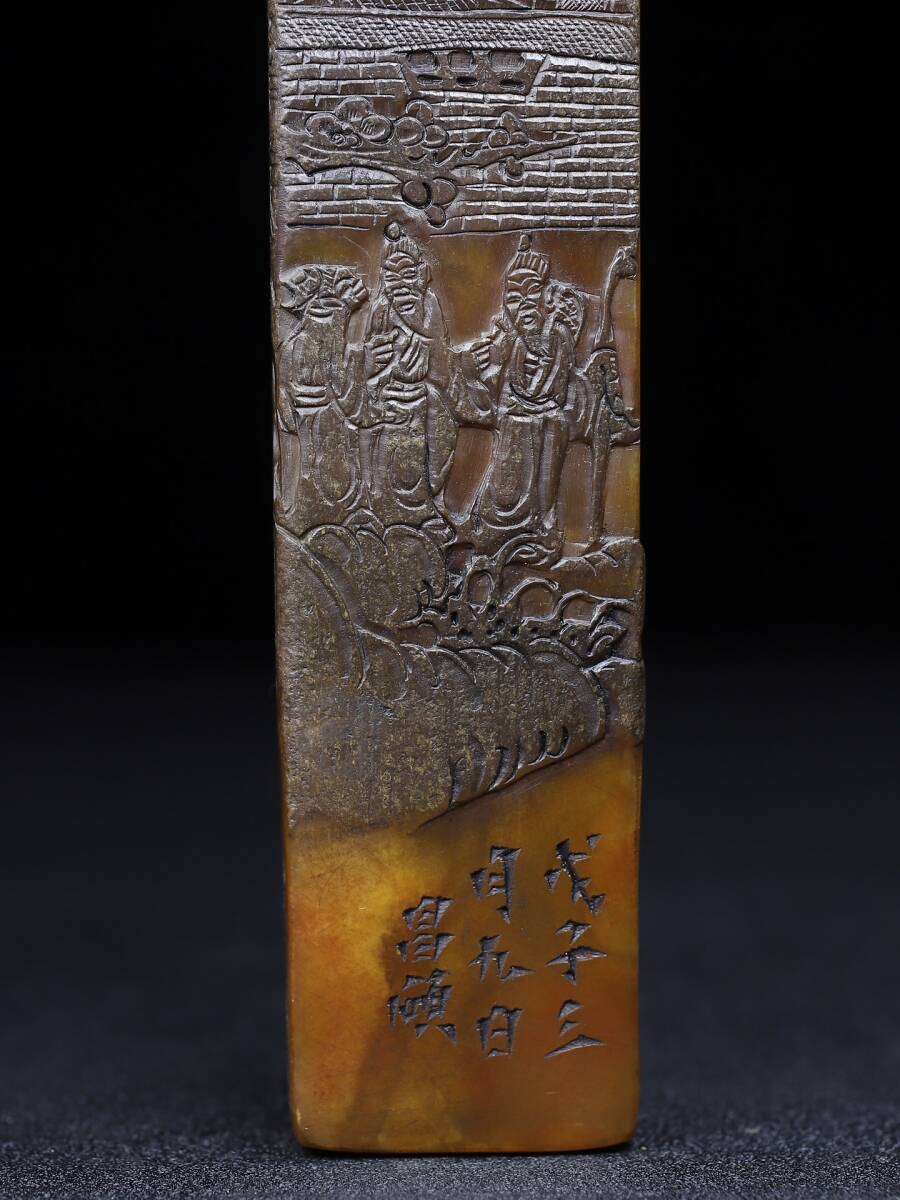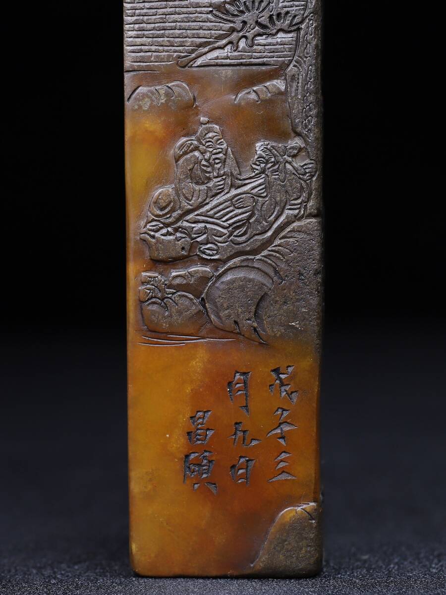 館蔵 烏鴉皮寿山石 山水人物紋 印鑑 天然石 手彫 篆刻 古印材 極細工 中国古玩 古美味 骨董品 中国古美術 古美味 蔵出