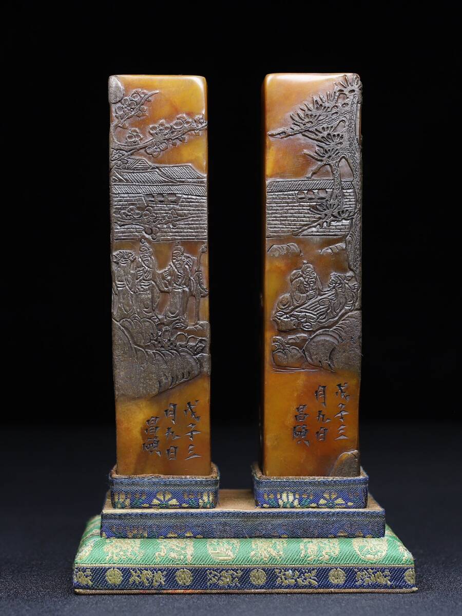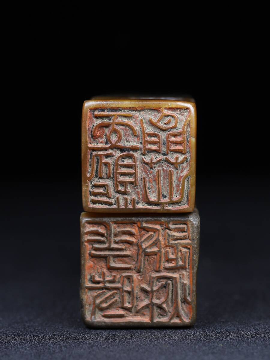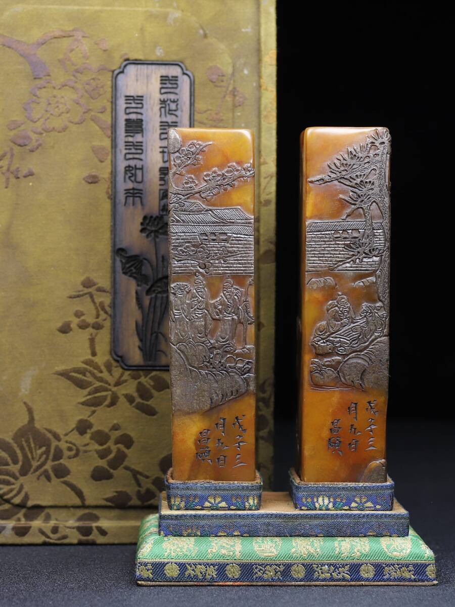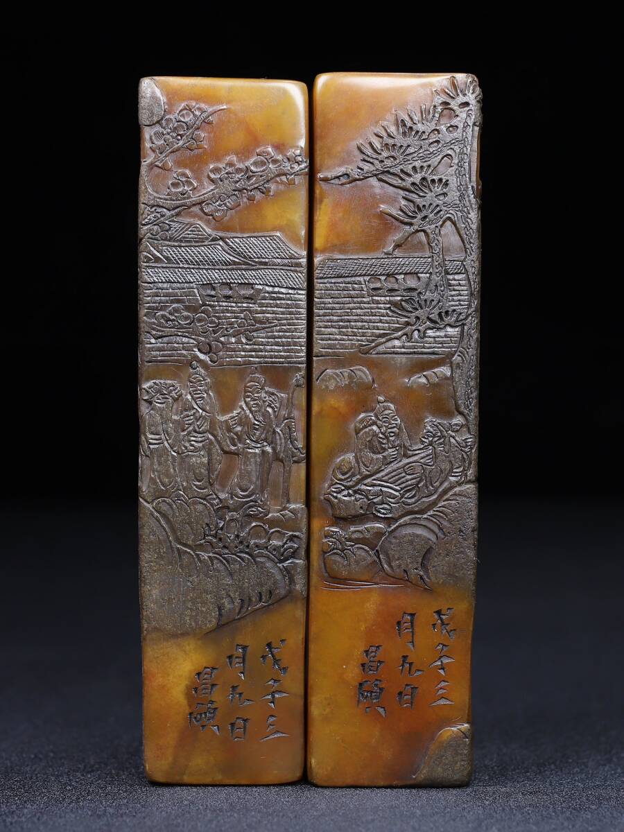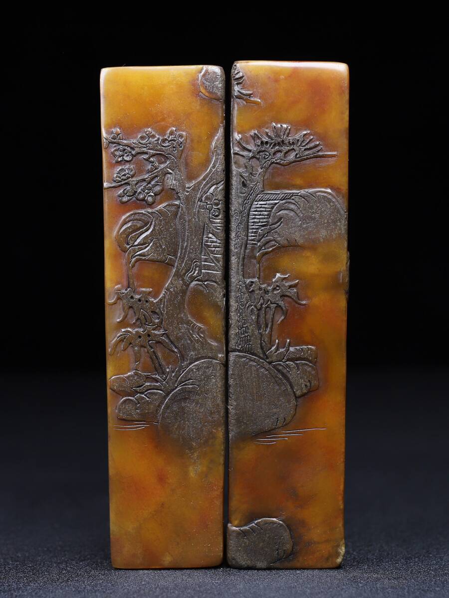 館蔵 烏鴉皮寿山石 山水人物紋 印鑑 天然石 手彫 篆刻 古印材 極細工 中国古玩 古美味 骨董品 中国古美術 古美味 蔵出