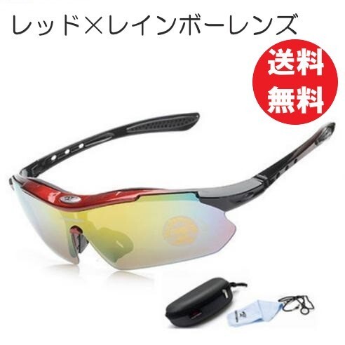 送料コミコミ☆収納ケース付 スポーツサングラス 4点セット レッド×レインボーレンズ 紫外線カット サングラス メンズ ランニング