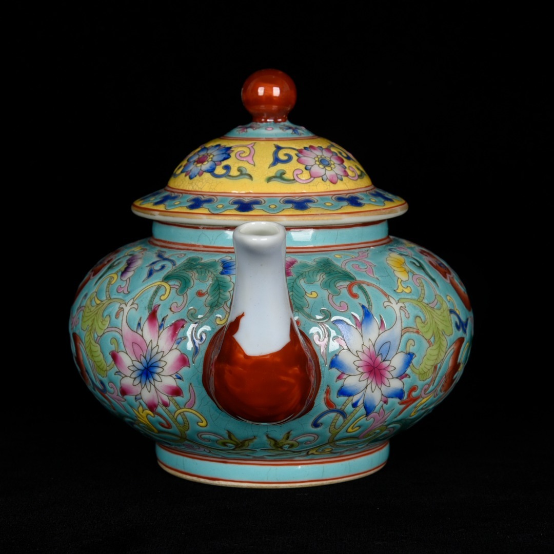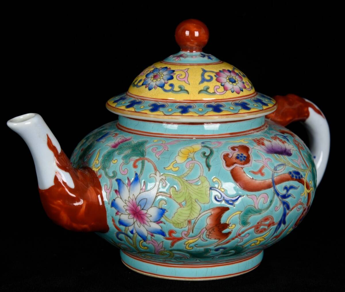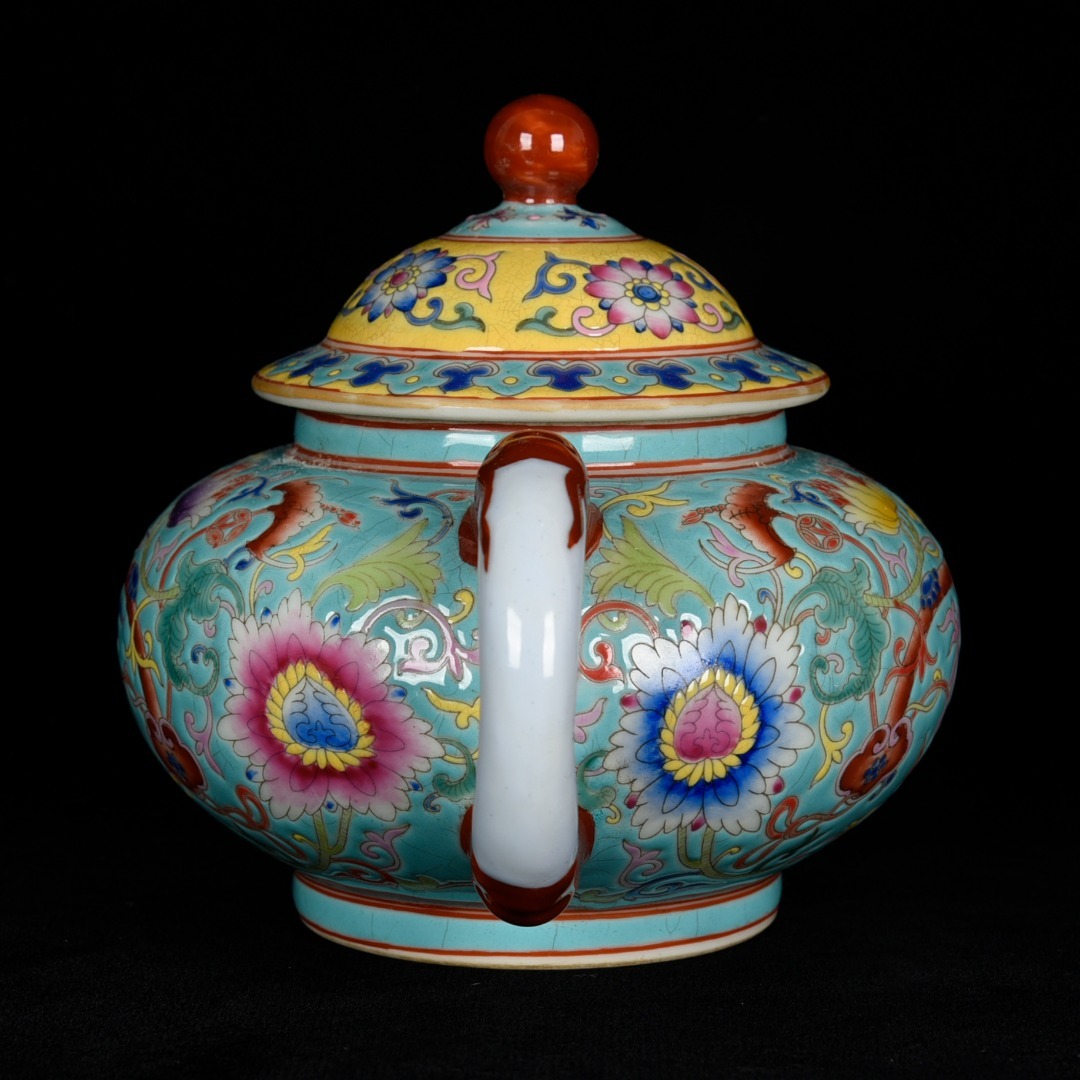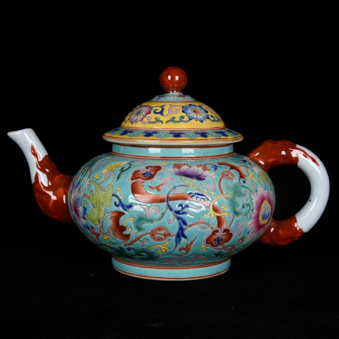 館蔵 清時代 雍正年製 緑地 琺瑯彩 纏枝花如意紋 茶壺 酒壺 古陶瓷 陶磁器 中国古美術 古美味 蔵出