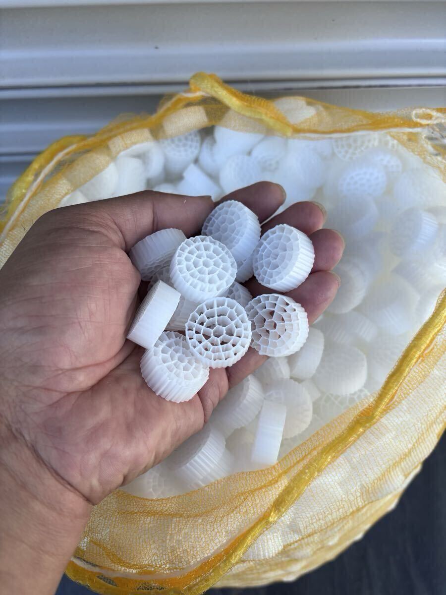 この濾過材は、流動床式生物膜処理(MBBR:Moving Bed Biofilm Reactor)という革新的な水処理技術を採用しています。水中で濾材を浮かせて常に動かすことで、その表面にバクテリアの膜が自然に形成され、飼育水中のアンモニア・亜硝酸・有機物などの有害物質を効率的に分解します。