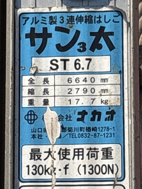 | タイトル | 【1円スタート!】ナカオ アルミ製 3連 伸縮はしご サン太 ST6.7 最大使用質量130Kg 梯子 ハシゴ 動作良好 ※直接引き取り限定※ |