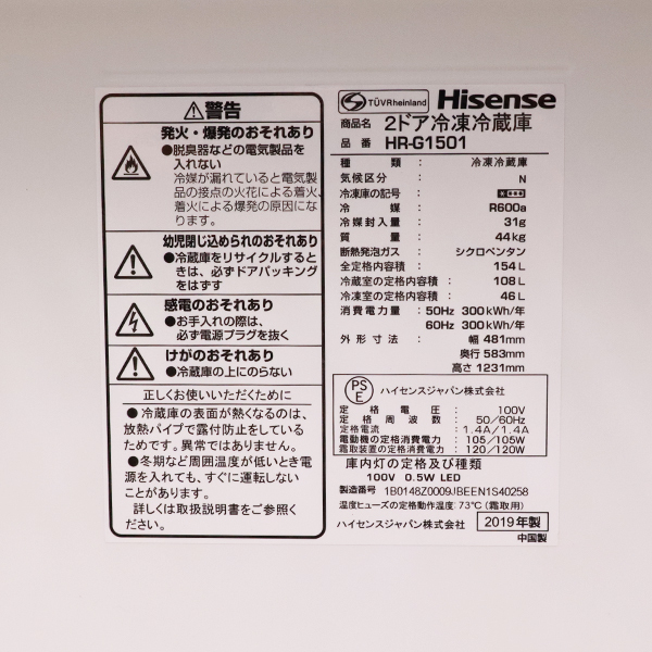 中古 冷蔵庫 Hisense/ハイセンス HR-G1501 2019年式