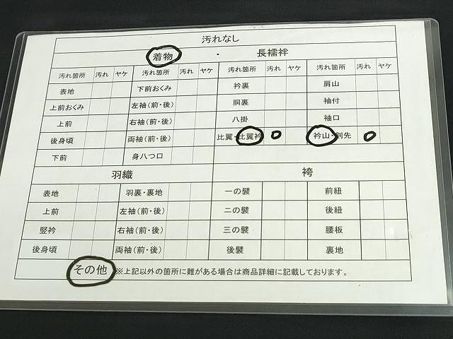 | 身丈 155cm(肩から) 裄丈 63.5cm 袖丈 47cm 縫込み 3cm 袖幅 32cm 前幅 23.5cm 後幅 28cm 着物縫いこみ 内揚げ 1cm 裄 お袖側 約1cm 身頃側 約0cm 《 サイズについてはこちら 》 |
