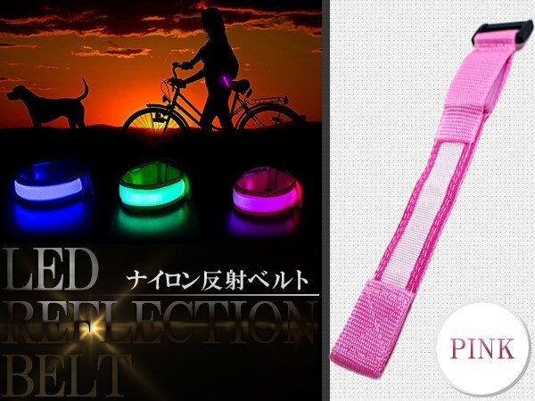 【送料250円】LED 反射ナイロンベルト ピンク 反射ベルトストラップ 散歩/ウォーキング 反射ベルト 夜間 安全対策 犬 猫 セーフティベルト