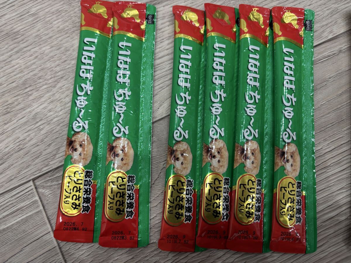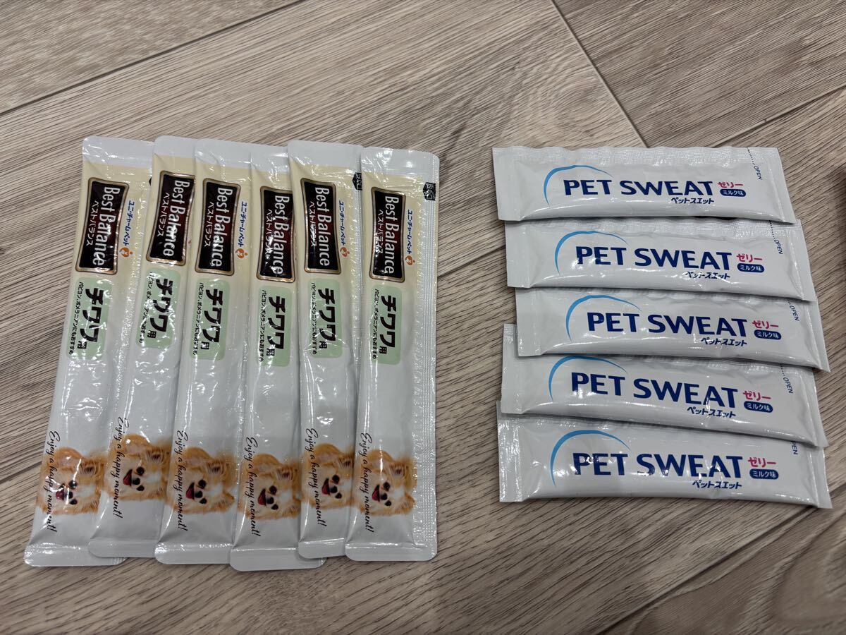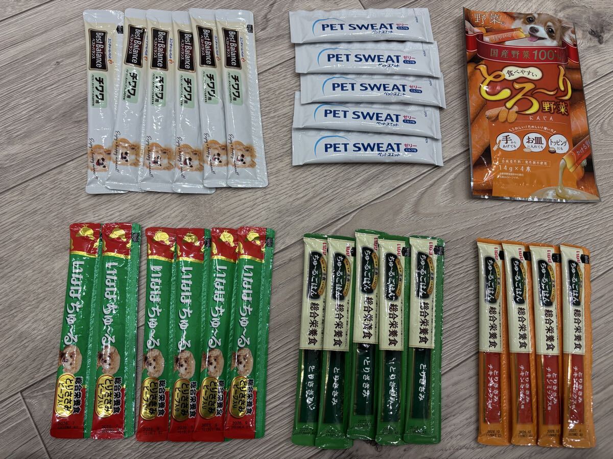 全犬種対応のチキン、サーモン、ビーフフレーバーのスティック状おやつと飲料のセットです。
