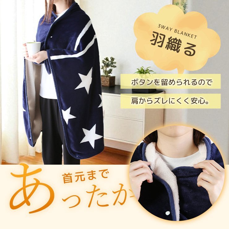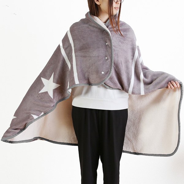 大判ブランケット 140×103cm ひざ掛け 腰巻き フランネル リバーシブル ボタン付き お洒落 洗える 毛布 ケット 防寒 スターグレー